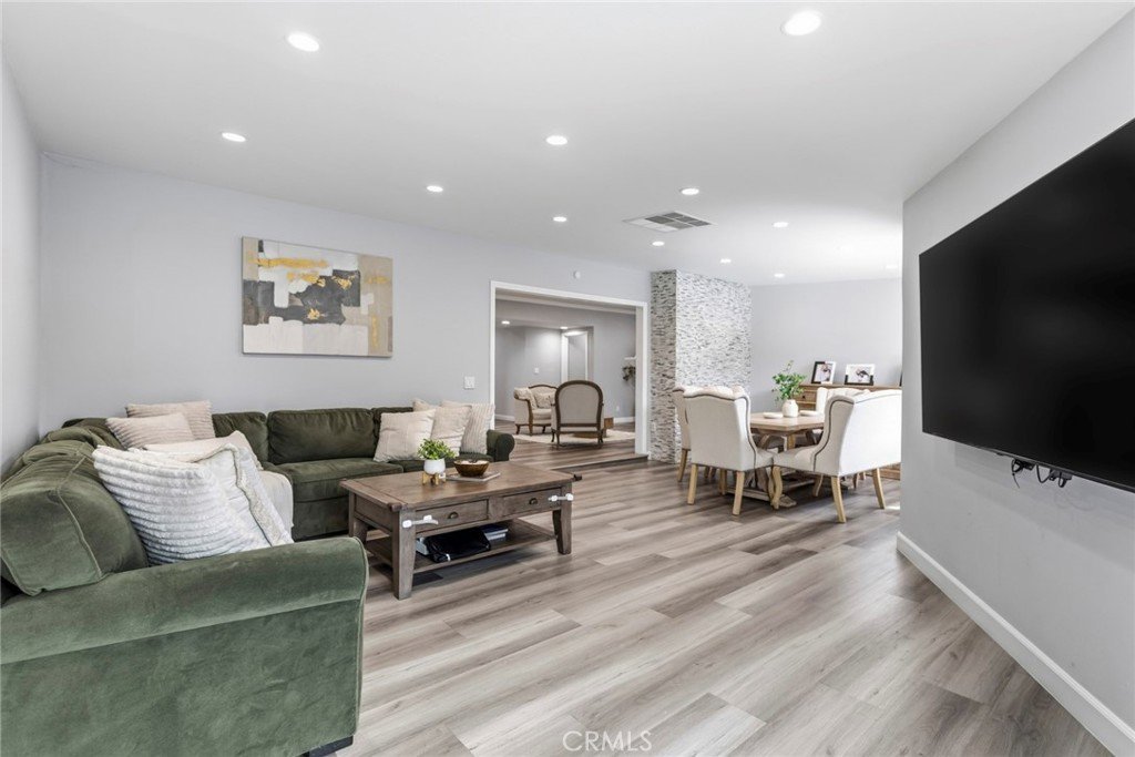 Welcome to this exquisitely remodeled pool residence, gracefully positioned along a serene, tree-lined street in North Hills West. From the moment you arrive, the home’s striking curb appeal makes a lasting impression, featuring a stacked stone façade, an expansive brick and concrete driveway, and a charming front porch framed by an oversized wood entry door. Inside, approximately 1,800 square feet of thoughtfully designed living space unfolds with a formal entry, spacious family room, elegant living and dining areas, three bedrooms, and three bathrooms. Wide-plank wood-look flooring, new interior doors, inviting paint selections, recessed lighting, custom built-ins, and designer fixtures create a refined yet inviting space, while abundant windows flood the space in natural light. The expanded kitchen is both stylish and functional, offering an abundance of white shaker cabinetry with custom detailing including a built-in wine rack and glass display, quartz countertops, under-cabinet lighting, stainless steel appliances, a farmhouse sink, and a chevron-pattern subway tile backsplash. A charming breakfast nook provides the perfect setting for casual dining. The formal dining area enjoys beautiful views of the backyard, while the living room is anchored by a beautifully appointed fireplace with custom tile and mantel. The primary suite offers generous closet space with mirrored closet doors and a remodeled private bath complete with a walk-in shower and quartz vanity with vessel sink. Secondary bedrooms are well proportioned with ample storage. The updated hall bath showcases a white oak vanity with quartz countertops and a tub/shower combination with custom tile work. Modern amenities include a two-car attached garage, newer HVAC system, tankless water heater, dedicated pool bath, and an indoor laundry room with storage. Step outside to your private retreat, featuring a sparkling pool, an above ground spa, and an expansive custom patio designed for effortless entertaining and large gatherings. Ideally located near schools, shopping, and convenient freeway access!