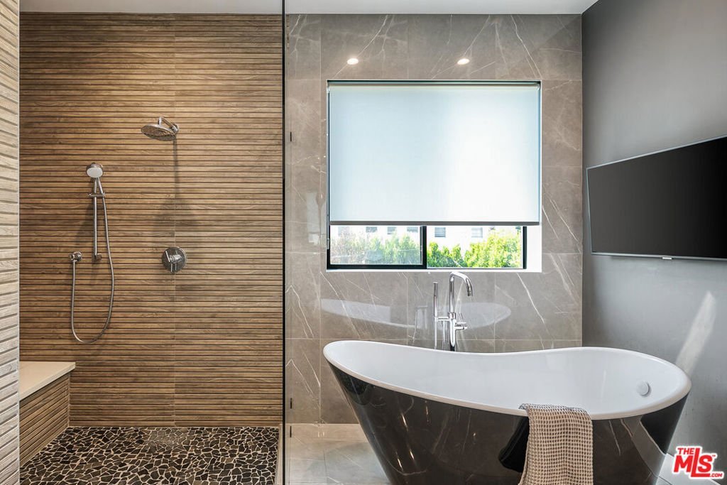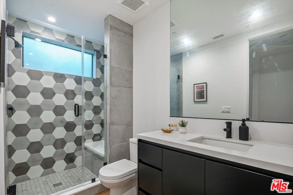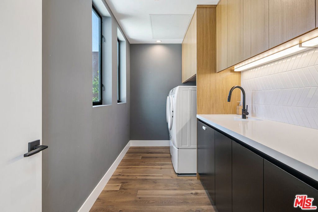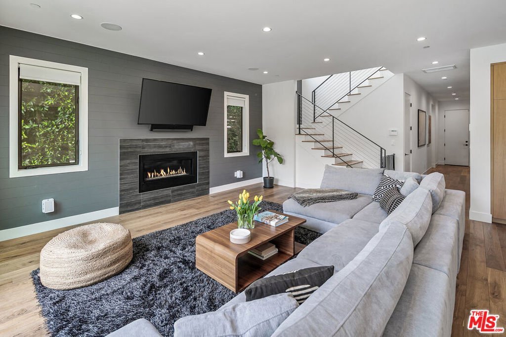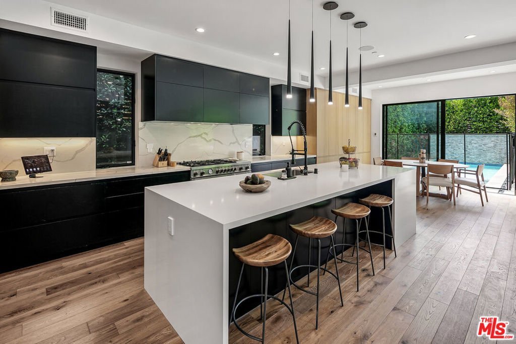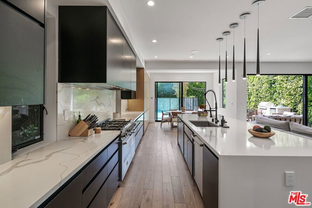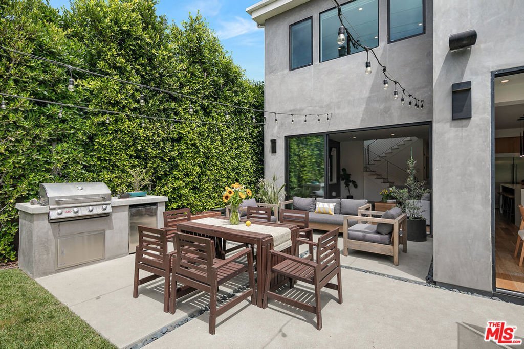 Enter through the automatic gate to this private architectural home and be transported into your tranquil coastal retreat. Built in 2019, this modern and bright 5 bedroom, 4 bath home features a formal dining area, a guest bedroom/office, a full bath, a spectacular gourmet kitchen with a walk-in pantry, an oversized island, and a breakfast bar. The great room has a fireplace and floor-to-ceiling glass stacking doors that open to a sun-drenched entertainer's backyard. The yard features a luxurious heated pool, spa, lush walls of tropical greenery, a mature fruit garden, and a spacious lawn. The built-in BBQ, outdoor Sonos speakers, and string lights maximize the home's indoor-outdoor living experience. Upstairs, you'll discover the primary bedroom with a cozy fireplace, a large, light-filled bathroom with a freestanding soak tub, a walk-in shower, dual sink vanity, and a walk-in closet. On the second floor, you will also find 3 spacious bedrooms, 2 full baths, and a 2nd-floor laundry room. 1037 Palms is located in a prime Venice location, steps away from the hottest destinations on Lincoln Boulevard, including Superba, Zinque, and Barry's Bootcamp. You will be a short stroll from iconic Abbott Kinney shopping and restaurants, a 1.5-mile bike ride to Venice Beach, and have easy access to LAX, the 10, 405, and 90 freeways. Grab your bike, surfboard, and toothbrush, and experience life in Venice!