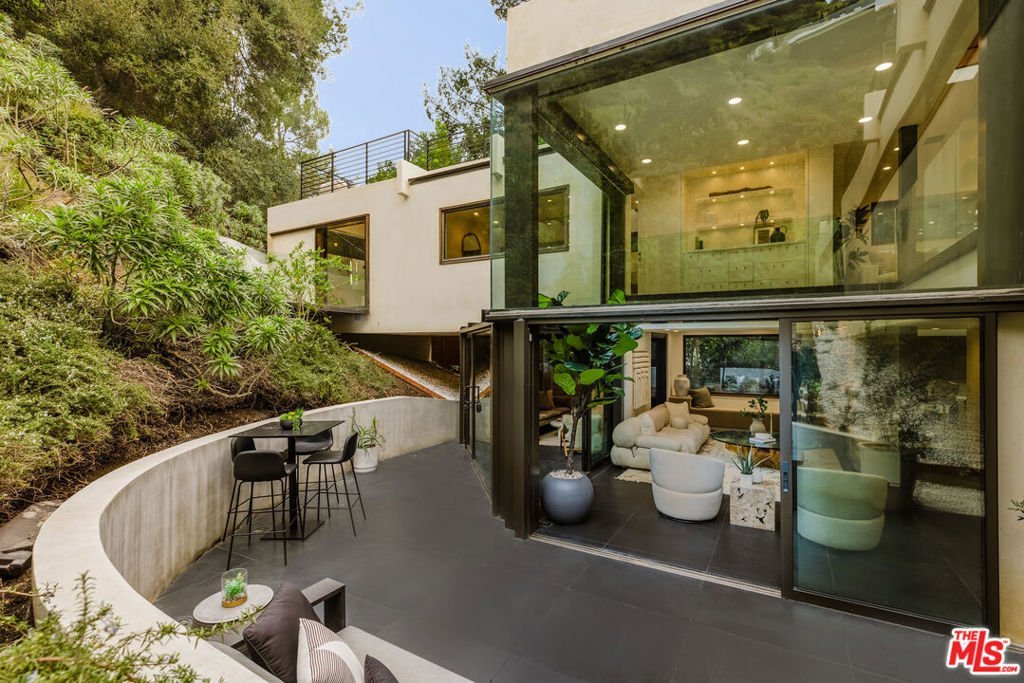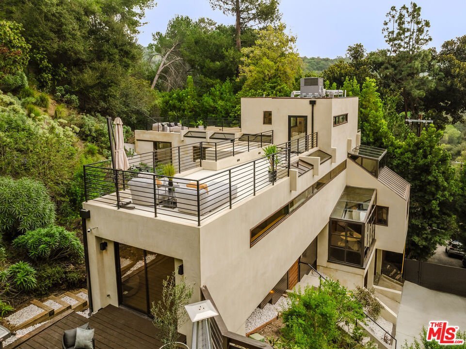 Tucked at the end of a quiet cul-de-sac in a secluded Bel Air canyon, this reimagined, architecturally designed modern residence offers exceptional privacy, while remaining just five minutes from Sunset Boulevard, a few minutes from the Beverly Hills Golden Triangle, and approximately ten minutes from UCLA. Enjoy effortless access to Hotel Bel-Air, Rodeo Drive, and the premier shopping and dining corridors of Beverly Hills and Bel Air, plus Westfield Century City, with quick access to the 405 Freeway for convenient connectivity across the Westside and beyond. Originally designed by local architect John Kilbane in the tradition of John Lautner, this one of a kind residence sits on approximately 1.5 acres and spans across approximately 3,000 square feet. The home features three bedrooms and three-and-a-half bathrooms across three levels. The residence has undergone a comprehensive exterior transformation and is finished in new beige stucco, thoughtfully reimagined with materials selected for the Bel Air hillside environment. Inside, walls of glass define the main living spaces, complemented by new and refinished wood flooring, updated electrical systems, and a comprehensive LED lighting upgrade. A Lutron-based lighting system with programmable scenes is paired with automated blinds and smart home security. The kitchen is outfitted with premium appliances, including a Sub-Zero bottom-freezer refrigerator with a new compressor, Gaggenau range, as well as Miele ovens and dishwasher. Situated between the living and dining rooms lies a premium dual-zone wine refrigerator. Living and dining areas extend into multiple sunrooms and outdoor terraces, with two exterior balconies enhancing indoor-outdoor living across levels. The primary suite offers a spa-style ensuite bathroom and a private balcony overlooking the canyon. A sculptural spiral staircase leads to the third level, a true retreat with its own bedroom, steam shower, and refreshed mini kitchen, well suited for a home office, studio, gym, or guest suite. Bathrooms have been refreshed with updated sinks, faucets, shower heads, exhaust fans and new grout throughout. The grounds are designed for enjoyment and ease of ownership, featuring expansive flat outdoor areas, multiple seating and entertaining zones with upgraded fencing. Above the main flat backyard space lies wooden steps leading up above to another flat grass area which allows for additional entertainment space, a dog run, walking trail, and even further possibilities for an additional structure. This vantage point from above allows for even greater mountain views and offers a world of possibilities while keeping total privacy. Conceived as a living landscape by UK arborist Josh Marcuson, the gardens feature curated native plantings, fruit trees, and a butterfly and bee garden with extensive mallow plantings selected to support Monarch butterflies creating a rare and meaningful nature connection. A professionally installed irrigation system supports water-efficient landscaping throughout the property, while outdoor lighting across the front, back and side yards and parking lot adds both ambiance and safety. Additional features include gated entry with smart access, a backup generator, two single-car garages, and six guest parking spaces. The offering includes four additional parcels, five total, providing long-term flexibility and value. The property's size and configuration offer flexibility for future exploration and potential building, subject to buyer due diligence and approvals.