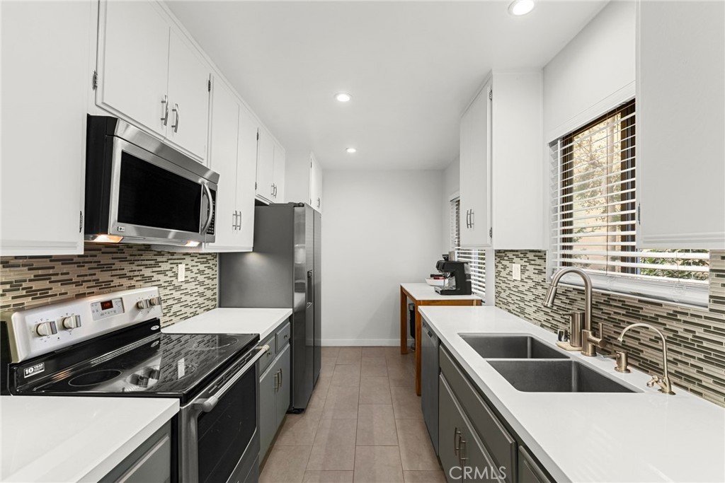 Massive price improvement! Tucked away in a quiet rear corner and elevated above the street, this stylishly reimagined condo offers an exceptional blend of modern comfort and everyday convenience. The spacious living and dining areas feature pristine Vintage White Oak hardwood flooring, recessed lighting with smart Wi-Fi dimmers, and sliding glass doors that open to a private balcony — an ideal spot to enjoy the surrounding greenery and peaceful setting. The remodeled kitchen is a true showpiece, complete with sleek Caesarstone countertops, a custom backsplash, newer appliances including a stainless steel Bosch dishwasher, and a charming breakfast nook perfect for casual mornings. The expansive primary suite offers a walk-in closet, an additional closet for extra storage, and sliding doors leading to a second private patio for relaxed outdoor lounging. The en-suite bath has been beautifully updated with dual vessel sinks, a tiled shower, and a chic sliding shadow-glass door for added privacy. A generously sized second bedroom also features a walk-in closet, while the fully renovated guest bath showcases modern finishes throughout. Additional upgrades include an August Wi-Fi smart lock, a new electrical panel, and a newer HVAC system (installed in 2015) controlled by a Nest smart thermostat. The building's community laundry is FREE (covered by HOA), and underwent a full interior remodel in 2018, adding to the home’s overall appeal and efficiency. Ideally located across from Gelson’s, around the corner from Barry’s Bootcamp, and less than a mile from the best dining, shopping, and nightlife West Hollywood has to offer, this condo delivers the perfect balance of location, style, and convenience.