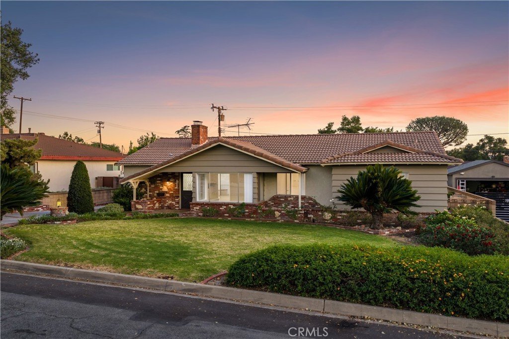 A classic California ranch positioned in a quiet foothill neighborhood in North Glendora. This single-story home presents at the street with a Spanish-style tile roof, brick and wood siding, mature sago palms, and a brick-ribbon driveway leading through a black gated entry to the rear detached two-car garage. The covered brick front porch frames a leaded geometric glass door, opening to wide-plank, wood-patterned tile flooring and crown molding throughout. The living room features refinished original hardwood floors, a floor-to-ceiling white-painted brick fireplace with a thick wood beam mantel, and connects to a glass-enclosed sitting room with three walls of windows framing the front lawn and mountain views. The dining room showcases an exposed wood beam vaulted ceiling, white wainscoting, recessed lighting, and a sliding glass door leading to the rear patio. The kitchen is finished with white cabinetry, quartz countertops, and a subway tile backsplash, and stainless steel appliances including double wall oven, gas cooktop with range hood, dishwasher, a raised tray ceiling with LED lighting, and a peninsula with bar seating. The primary suite offers hardwood floors and an en suite bathroom with a gray shaker double vanity, white quartz countertop, and a frameless glass walk-in shower finished in marble-look subway tile with a mosaic accent border. Additional bedrooms are carpeted and include mirrored closet doors, ceiling fans, and crown molding. The hall bathroom features a vessel sink vanity and a tub and shower combination with a tan tile surround. A dedicated laundry room connects to the rear grounds. The backyard offers a flat lawn, a covered patio with concrete decking and a brick border, brick planters, producing citrus trees, and block wall fencing. A brick paver patio extends from the covered back porch to a built-in brick fireplace and chimney, with an adjacent BBQ station creating a second area for entertaining.