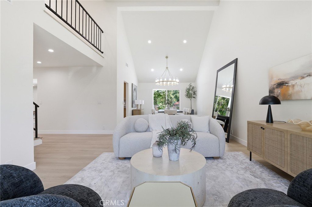 As you enter through elegant wrought iron doors, you’ll be greeted by a bright, open floor plan. The high-ceiling formal living and dining area is bathed in natural light, creating an inviting atmosphere perfect for entertaining. The custom kitchen is a standout feature, boasting top-tier cabinetry crafted by the Pacific Design Center on Melrose, stainless steel appliances, quartz countertops and backsplash, and a stunning waterfall-edge island that unifies the space. A cozy sitting area with direct access to the backyard and a statement fireplace fosters a warm ambiance, making it the ideal spot for gatherings.