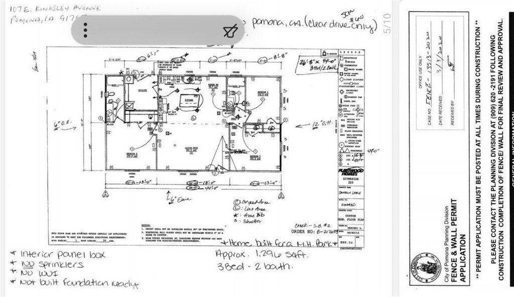 Due to interior condition it will not qualify for traditional financing. Per City of Pomona- current zoning requirements of the RND1 zoning district. As situated, the structure does not meet numerous zoning requirements, including but not limited to, setbacks, the build-to depth for the street frontage, the active depth, and transparency requirements. I do not see how this structure can meet the City of Pomona zoning requirements in its current location. It would appear that the structure would need to be relocated on the site and the front facade redesigned, just to have a chance at meeting our zoning requirements. Home has been red tagged by City. Do not enter the home. Lot can be walked only.