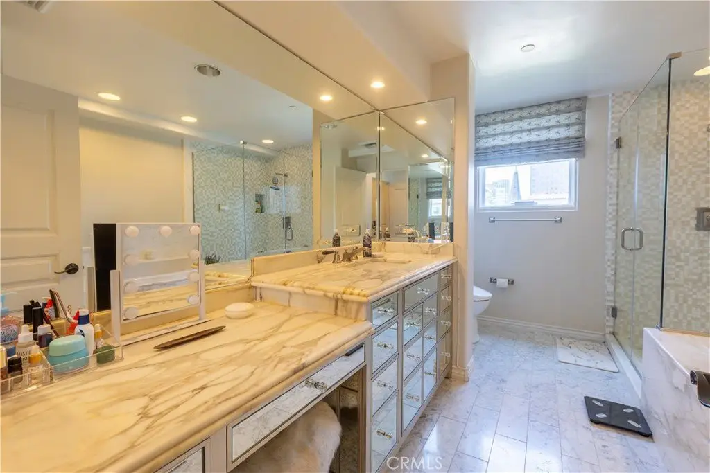 Experience refined living in this elegant 2-bedroom, 2.5-bathroom residence situated in Westwood. Located just moments from UCLA, Westwood Village, Beverly Hills, and the 405 freeway, this condo offers the perfect balance of city convenience and tranquil comfort. This bright and spacious home features oversized windows, coffered ceilings, a custom hand-painted mural, a cast stone fireplace, and a private balcony off the living area. The primary suite offers a large walk-in closet, three additional balconies, and a luxurious ensuite bath with a soaking tub and glass-enclosed shower. The second bedroom also includes its own ensuite for added privacy and comfort. Community amenities include 24-hour concierge, fully equipped gym, banquet room, and rooftop terrace with BBQ and stunning views. This is Westwood condo living at its finest—refined, well-connected, and designed for modern luxury