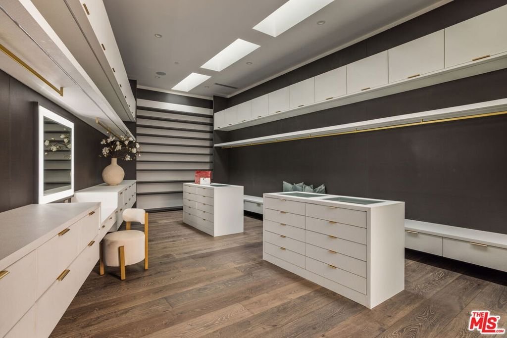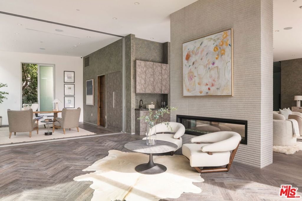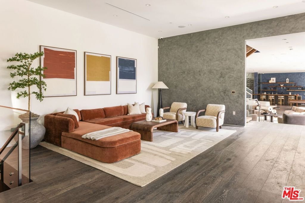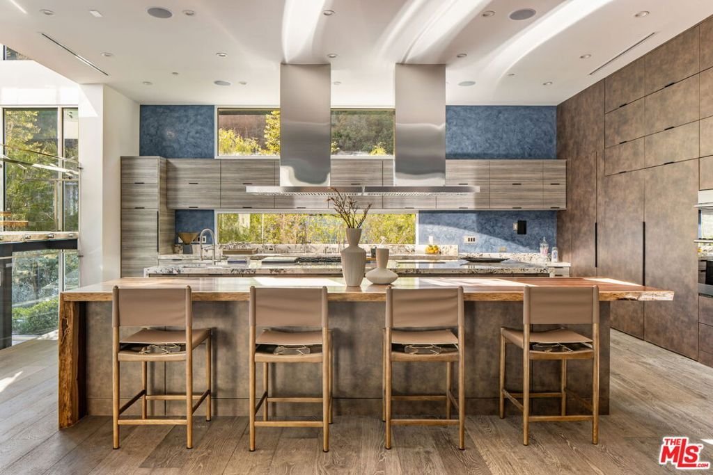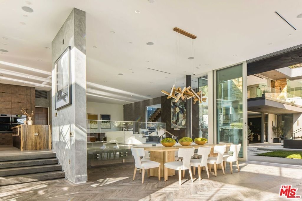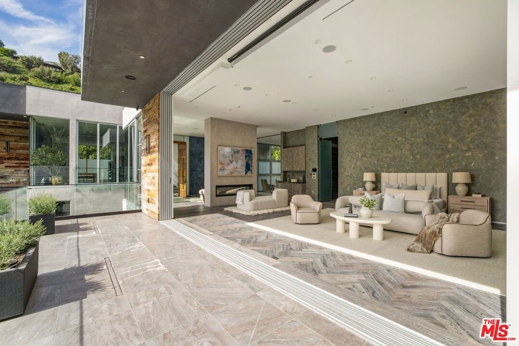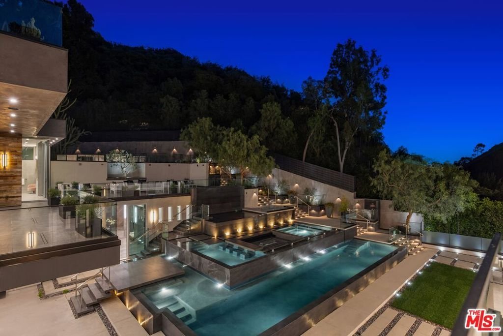 A rare offering in Bel Air, this newly constructed gated estate pairs architectural ambition with complete privacy and resort-caliber amenities. Designed as a true compound, the home unfolds across approximately 18,500 square feet with 7 bedrooms and 16 bathrooms on a 29,883-square-foot lot surrounded by hillside views and mature landscape.A double-height foyer sets the tone, leading into a grand great room where retractable walls of glass create seamless continuity between interior living spaces and the central courtyard. The chef's kitchen is both sculptural and highly functional, appointed with refined Italian cabinetry, a dedicated galley and two oversized islands finished in exotic stone and live-edge Brazilian redwood. Professional-grade appliances include gas and induction cooktops, double ovens and full refrigerator and freezer columns with stainless interiors.Entertaining is thoughtfully layered throughout: a grand family room anchored by a purpleheart wood bar, a temperature-controlled glass wine cellar accommodating over 1,000 bottles and a private cinema with stadium seating for 20 and a 200-inch screen. A dedicated wellness wing features a fitness studio and Roman-style bath with steam and hydrotherapy elements.Upstairs, the approximately 2,700-square-foot primary suite offers the scale and privacy of a standalone residence, complete with dual boutique-style closets, sitting room, office, fireplace, terrace and a spa bath with double rain showers, steam, soaking tub and separate water closets.The grounds center on a terraced pool and spa with waterfalls, stepping stones, a swim-up bar and fire pit lounge. A detached 1,300-square-foot guest house (ADU) with two bedrooms, three baths, full kitchen, rooftop deck and wraparound balcony completes this exceptional Bel Air estate.