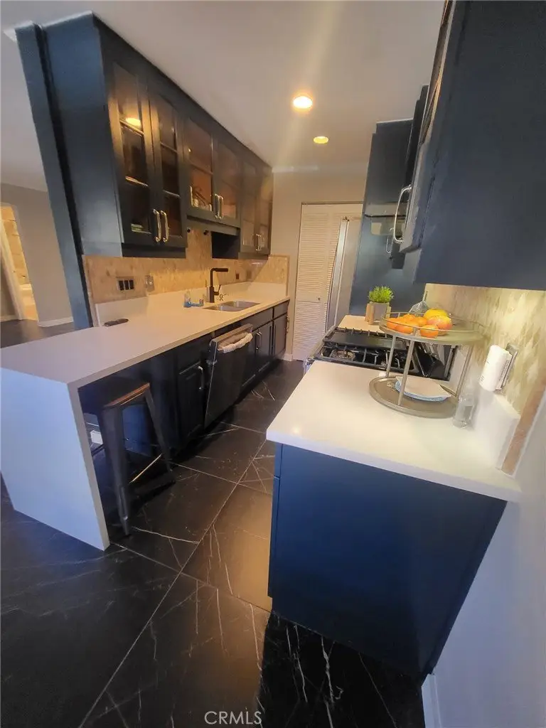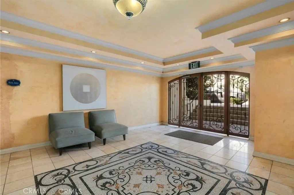 Modern, move-in ready 1BD/1BA with balcony in gated Brentwood Villas. Sunlit, north-facing, single-level home features an open living/dining area finished in oversized marble-look porcelain tile, crown molding, recessed/track lighting, and a ceiling fan. Designer kitchen with white quartz counters and a waterfall peninsula for stool seating; full-height travertine backsplash; custom dark cabinetry with glass uppers; matte-black faucet; double-bowl sink; pantry/utility niche; and a stainless appliance suite including a 5-burner gas range with chimney hood and dishwasher. The spacious bedroom offers bamboo flooring, a ceiling fan, and a walk-in closet with built-ins. Updated bath showcases a floating vanity with LED mirror, stone mosaic tile, and a tub/shower with glass enclosure. In-unit stacked laundry behind louvered doors. Private balcony overlooks a tree-lined street—perfect for morning coffee. Community amenities include a pool, dry sauna, renovated fitness center (2020), secure lobby with elevator, and gated entry; HOA includes earthquake insurance. One assigned gated parking space.