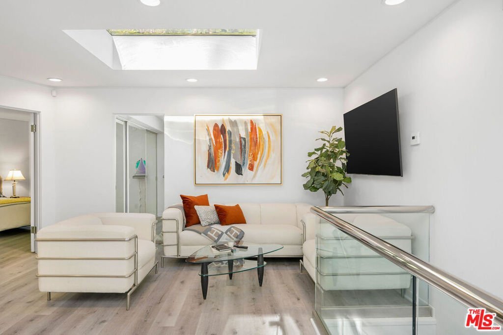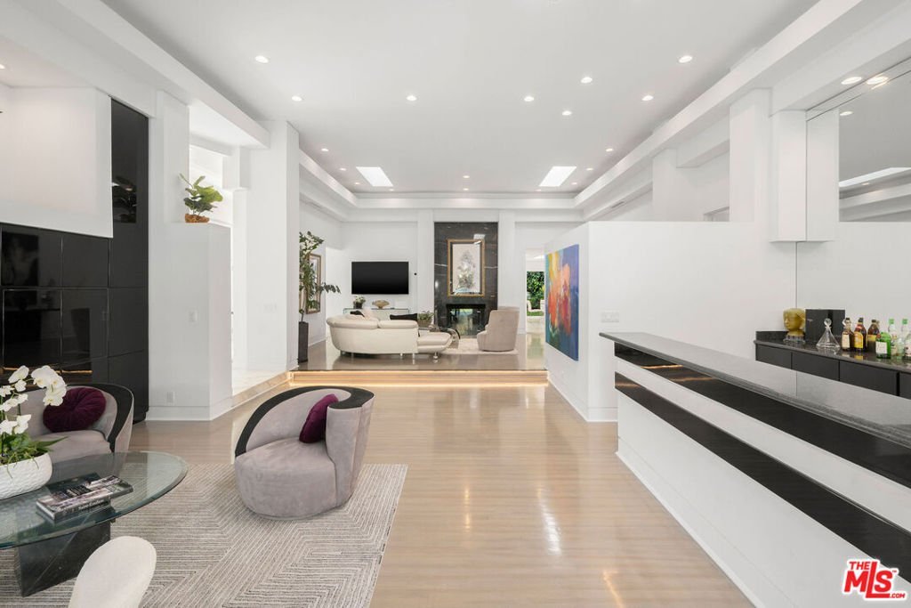 Privately tucked behind tall hedges and gates on one of the most desirable streets in Beverly Hills, this Art Deco estate offers exceptional scale and privacy. Originally designed and built by renowned Hollywood couture designer Dina Barel, the home reflects timeless design and thoughtful attention to detail throughout. Set on over half an acre of landscaped grounds, the property blends classic architecture with a layout that feels functional and inviting. High ceilings, skylights, and French doors fill the home with natural light, while quality finishes add warmth and polish. The main level is ideal for entertaining, featuring a well-appointed kitchen with high-end appliances, custom cabinetry, and a large island that opens to the dining area and wet bar, all with direct access to the backyard. Outside, a pool and spa, natural waterfall, mature palms, and multiple seating areas create a private setting perfect for both relaxing and hosting. Upstairs, the primary suite includes a fireplace, dual dressing areas, and spacious bathrooms with a soaking tub and steam shower. Additional bedrooms are bright and generously sized, complemented by a lounge area and separate staircase for added flexibility. A rare opportunity in a premier Beverly Hills location, this home offers privacy, quality, and timeless appeal, ready for its next owner to enjoy.