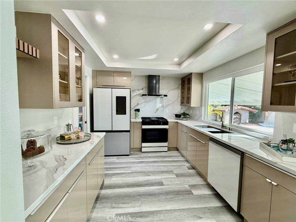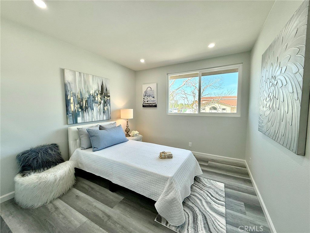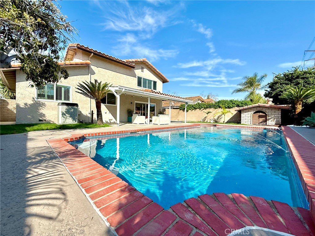 Welcome to this meticulously remodeled, two-level entertainer’s dream home, perfectly timed for summer enjoyment! Boasting over 2,000 square feet of elegant living space on a generous 6,849-square-foot lot, this 4-bedroom, 3-bathroom residence seamlessly blends modern sophistication with everyday convenience. A highly desirable main-floor bedroom and bath make it ideal for guests or multi-generational living. An impressive, oversized chocolate-cafe wood entry door with a decorative glass sidelight welcomes you into a sun-drenched interior, highlighted by a modern, geometric tiered crystal chandelier. The inviting living room features cathedral ceilings and recessed lighting, flowing naturally into a formal dining area. Neutral waterproof vinyl flooring runs throughout the entire home. The upgraded chef’s kitchen showcases quartz countertops and comes fully equipped with a five-burner cooktop, range hood, dishwasher, and a premium 3-door Samsung Bespoke refrigerator with a beverage center. The cozy family room is anchored by a romantic fireplace, tastefully modernized with acoustic slat wall panels and integrated LED lighting. Sliding glass doors create an effortless indoor-outdoor flow to your private backyard oasis, featuring a sparkling pool with fountain and heated spa. Upstairs, the spacious primary suite includes a walk-in closet and a double-sink vanity with a frameless LED mirror. Two additional bedrooms are well-appointed, sharing a modern hallway bath. Additional features include a durable tile roof, covered RV parking, a two-car garage with direct interior access and laundry hookups. Situated in the prestigious ABC Unified School District, this home is just minutes away from the premier Los Cerritos Center with specialty stores and popular restaurants, offering convenient access to all major SoCal freeways. Make your dream a reality with this stunning turn-key home!