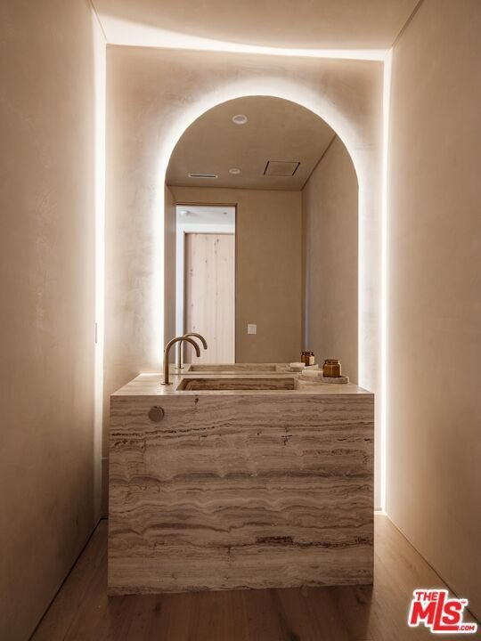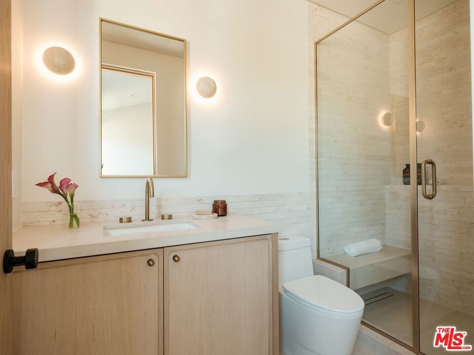 Introducing this breathtaking, one-of-a-kind home that blends sculptural architecture with warm organic materials for a serene, modern living experience. This custom-built home is situated within the highly esteemed Colfax Charter School District. Boasting 5BD/5.5BA, the property also includes a spacious casita offering open living space with an additional bedroom and bathroom. Upon entering the home, you're welcomed by hand plastered walls, curved aesthetics, and continuous wide-plank oak flooring that guides you through sun-filled spaces. The chef's kitchen is an organic showcase, centered around a gently rounded island, sculpted curved ceiling, rustic oak cabinetry, marble countertops, high-end appliances, and a walk-in pantry. The expansive family room features a sculpted fireplace wrapped in hand-finished brushed plaster and rustic curved shelving that enhances the warmth and texture of the space. Large sliding doors create a seamless transition between indoors and outdoors, revealing a resort-like sanctuary with a shimmering pool, spa, covered patio with a seating area and fireplace, and an outdoor cooking area, surrounded by lush greenery for ultimate privacy. The lower level features a cozy movie theater, an ensuite guest bedroom, and a powder room. Upstairs, the primary suite becomes a retreat of its own, boasting a softly rounded fireplace, a generous walk-in closet, and a large balcony with views of the tranquil, tropically landscaped yard. The spa-inspired primary bathroom offers a soaking tub, walk-in shower, and dual vanities finished in micro-cement and natural stone. Three additional ensuite bedrooms and a large laundry room complete the upper level. Enhanced with premium features including Control4 smart technology, whole-home surround sound, a security system with cameras, and energy-efficient solar panels, this home is both luxurious and thoughtfully connected. Located in the highly coveted community of Valley Village.
