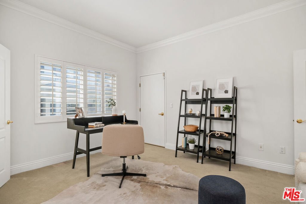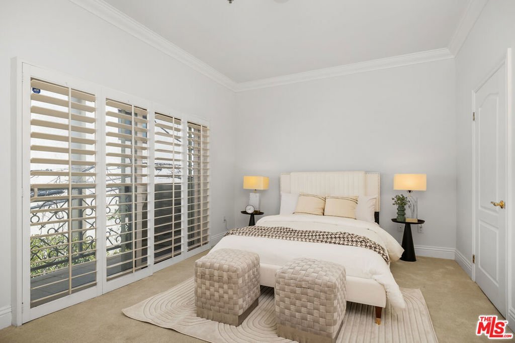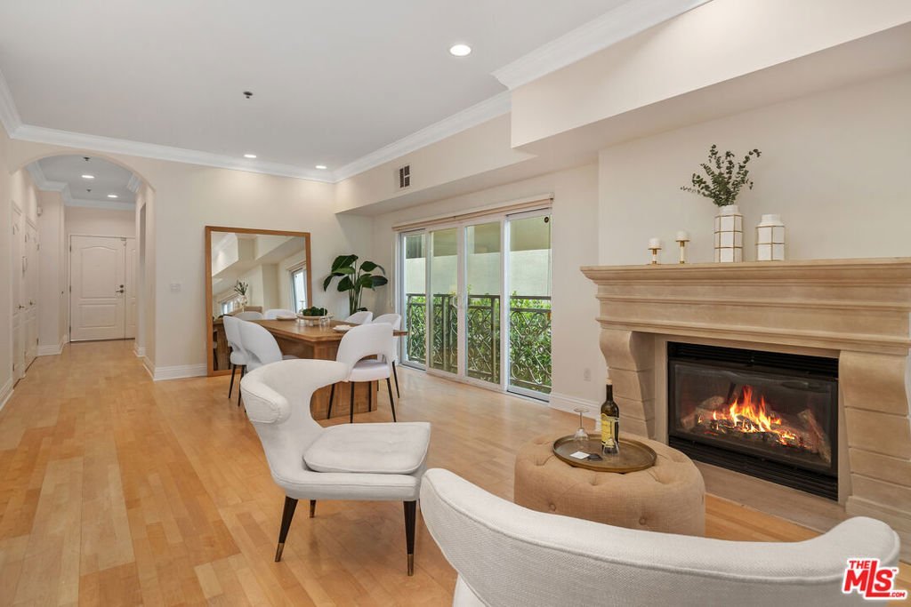 This refined elegant building is located near renown shops and restaurants in the heart of Brentwood. The luxurious single story condo features a formal entry leading to an expansive, light-filled living room/dining area lined with high ceilings, crown moldings, hardwood floors and a stone fireplace. The gourmet kitchen is equipped with custom made cabinets, granite countertops and stainless steel appliances. The primary bedroom offers a peaceful retreat with ample closets and a private balcony. The large ensuite bath has a spa-like tub, separate glass enclosed shower and double sinks. The second and third bedrooms have large closets and an adjoining bath, and provide versatile spaces that can accommodate guests or can be used as home office, hobby rooms or fitness areas. In unit laundry, AC, and plantation shutters throughout. Two assigned parking spaces in a secure garage.