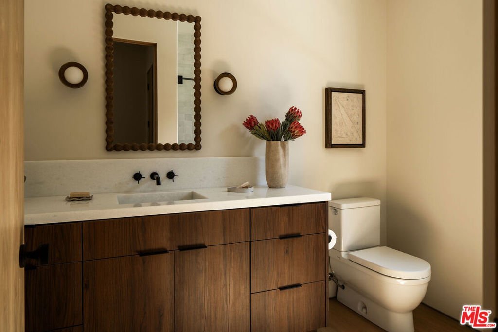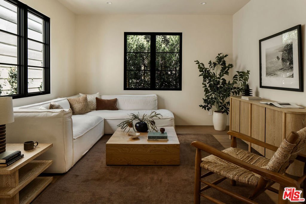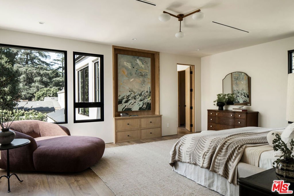 Nestled in the heart of Studio City's coveted Silver Triangle, this newly constructed modern farmhouse blends natural materials, designer finishes, and luxurious amenities to create a truly refined, light-filled sanctuary. Sitting on an oversized lot, the thoughtfully designed 5bed/5.5bath main house and separate 1bed/1bath guest house balance architecture and lifestyle with quiet ease. Inside, find the open concept main floor rooted in the dramatic grand foyer and sweeping curved staircase with high ceilings, white oak beams, and wide plank wood floors throughout. The chef's kitchen is appointed with custom white oak slim Shaker cabinetry, side-by-side large Sub-Zero fridge and freezer, 48-inch Wolf induction stove, Taj Mahal Quartzite counter tops, and two integrated sinks. Looking over an olive tree, the breakfast nook provides a haven for budding ideas and calm. The family room with built-in white oak shelving, fireplace, and floor-to-ceiling glass doors, opens to the outdoor oasis with sparkling pool and spa. Mature trees, lush landscaping, and an abundance of grass create an inviting environment for gathering. Upstairs, grounded by the vast landing, you'll find three en-suite bedrooms, two with balconies, a laundry room with built-in cabinets, and the primary suite, a beautiful and serene sunlit retreat with sitting area, large walk-in custom closet, designated make-up vanity and soaking tub. Outside, the separately addressed detached guest house features exceptional flexibility for guests, extended family, or can function as a private studio space. Additional amenities include: solar panels for house and ADU, built-in security cameras, integrated speakers, WIFI system, corrugated metal roof, and home control systems. The property is fully electric with no gas. Located south of Ventura Blvd, you are moments from Fryman Canyon, Erewhon, and The Shops at Sportman's Lodge, the Sunday Farmers Market, and all the exciting eateries and shops Studio City has to offer, plus easy access to Hollywood, the Westside, and one of the best public schools in Los Angeles, Carpenter Community Charter. This home offers a rare combination of impeccable design, warmth, and luxury in the ultimate location.