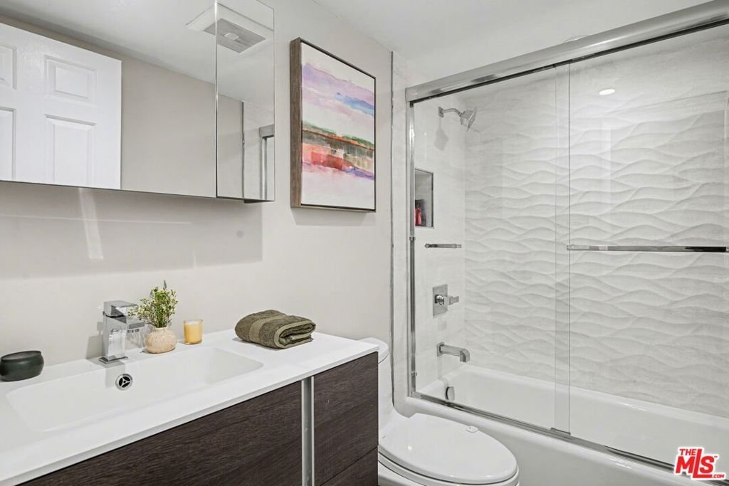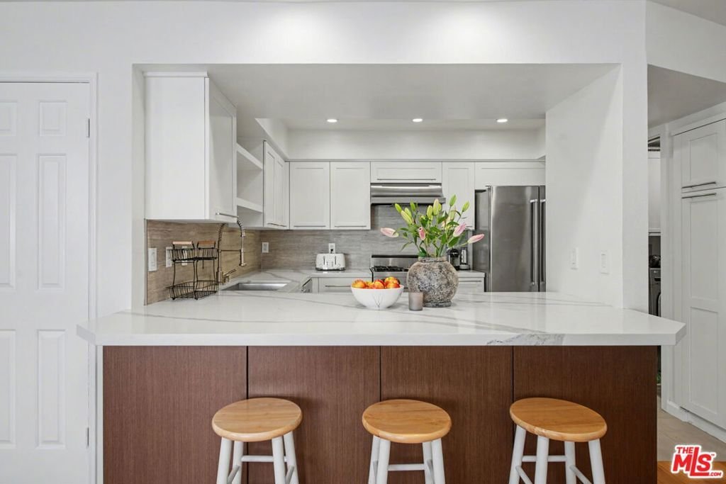 Exceptional Westside location for this beautiful top-floor, 2-bedroom, 2-bath condo. This unit blends style, comfort, and convenience. Vaulted ceilings and abundant natural light enhance the open layout feel. The renovated kitchen features quartz countertops and custom cabinetry with built-in knife and spice drawers, plus a mini bar with refrigerator for added function and style. Sliding doors off the living room lead to a private balcony, offering a quiet outdoor retreat. The spacious primary suite includes a custom walk-in closet system and en-suite bathroom, while the second bedroom offers flexibility for guests or a workspace. An upgraded guest bath and a dedicated laundry room with eco washer and dryer add everyday ease. Hardwood flooring, a newer HVAC system, and a fully integrated smart-home setup with Lutron switches throughout complete the home's modern appeal. Additional highlights include two tandem parking spaces equipped with a private universal EV charger, with a cable long enough to conveniently reach either space. The building offers controlled access with elevator service. The property is ideally situated in a desirable Westside setting, moments from grocery stores, coffee shops, and popular dining options, along with easy access to shopping, entertainment, beaches, and major employment centers. Fireplaces are considered decorative.