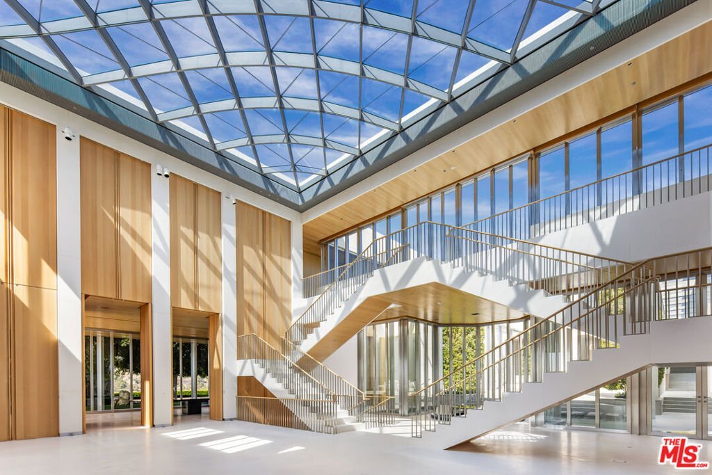 The Angelo Estate, designed by famed master architect, Ed Tuttle. The most spectacular contemporary estate in Los Angeles, truly one of the great estates in all of America. Perched on a 6-acre view promontory with unobstructed views across the entire Los Angeles basin from downtown to the ocean. Enter through a long gated private driveway to this museum quality stunning architectural masterpiece comprised of steel, glass, and limestone with onsite parking for 80-100 cars. The main house is built around a magnificent open courtyard with fountains. Enter an atrium foyer filled with natural light and reminiscent of IM Pei's Louvre installation. There are high ceilings and great walls for art throughout, a beautiful living room, formal dining, library, chef's gourmet kitchen, great room, incredible theatre, game room, bowling alley, wellness center, gym, wine cellar, and much more. Built by McCoy Construction with meticulous detail and perfection, there was no expense spared and no detail overlooked. All exterior walls are made of imported Italian limestone, while the interior walls and ceilings feature either the same limestone or rift-cut vertical grain white oak. The estate also includes state-of-the-art electronics and security with a security room. The house is heated and cooled by geothermal technology and has solar panels and a generator. Spectacular grounds include a green marble tiled infinity pool and spa, a full outdoor kitchen, a lighted tennis court and pavilion, stunning lawns, walkways, and gardens. There is a full 2-story 2-bedroom guest house and a separate guest apartment. The home is on a peninsula, not only ensuring privacy but opening to possibly the best view in all of Los Angeles. 16 bedrooms, 27 bathrooms, 18 fireplaces. This home is a true wonder, there is nothing else like it, and impossible to duplicate. Be sure to look at both interior and exterior photos, along with the dramatic drone shots on the property website. Shown to pre-qualified clients only.