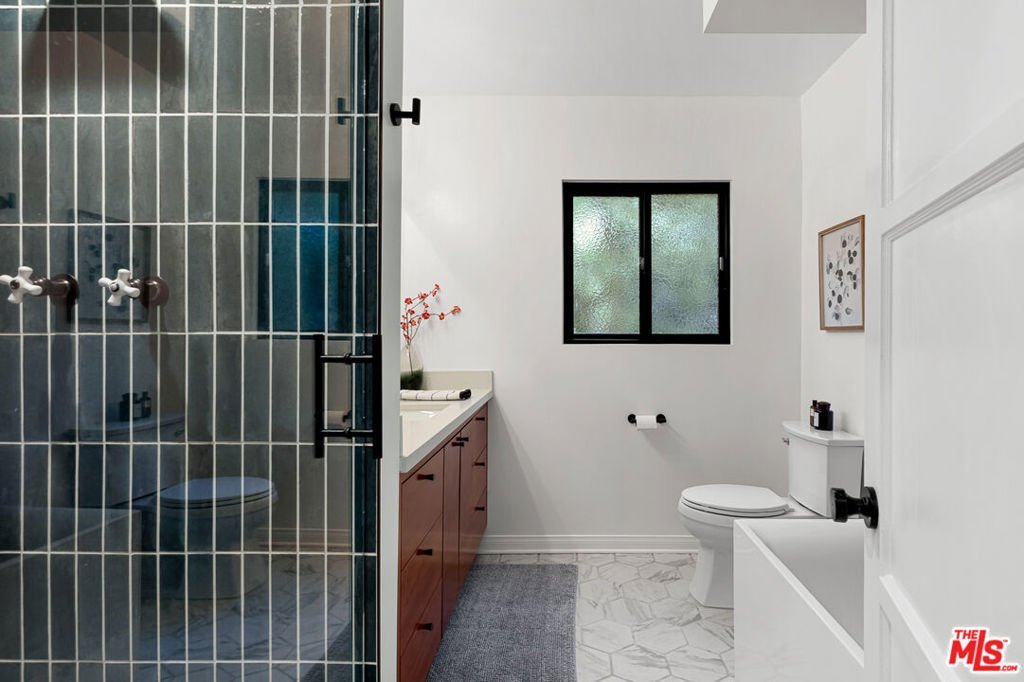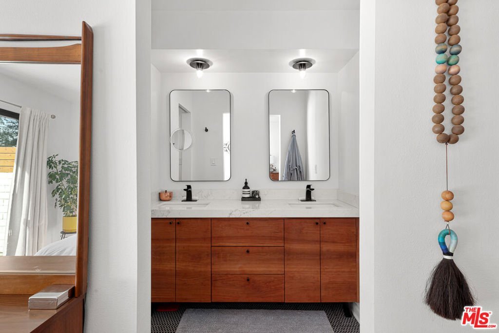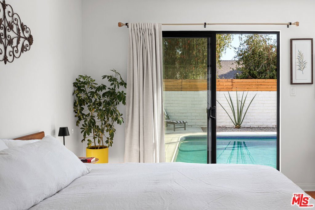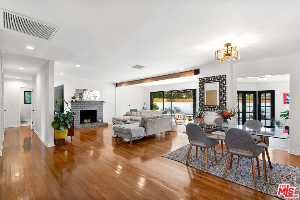Welcome to this beautifully appointed and tastefully updated Valley Village gem that effortlessly blends classic mid-century charm with modern sophistication. Perfectly nestled on a quiet cul-de-sac, this single-story retreat offers the rare combination of neighborhood tranquility and easy access to the very best of Los Angeles living. The thoughtfully designed floor plan features four bedrooms, including one that has been converted into a sleek, private home office. Two and a half well-appointed bathrooms, including a conveniently located powder room, round out the interior with both style and practicality. Original hardwood floors, exposed beams, and mid-century character combine seamlessly to create a timeless elegance throughout the home. The sun-filled family and dining rooms open naturally into a beautifully renovated kitchen equipped with state-of-the-art appliances and elegant custom cabinetry. The backyard was thoughtfully designed to host guests or enjoy private relaxation as the sparkling pool takes center stage, surrounded by a generous covered patio that offers shade, style, and plenty of room to lounge.
