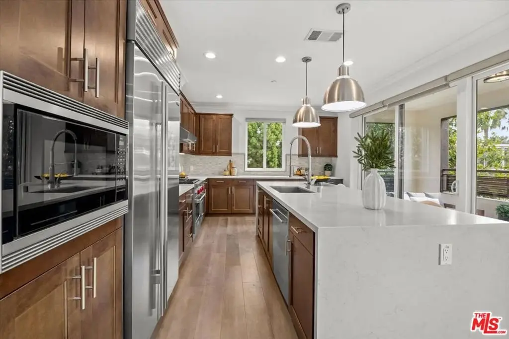One of Playa Vista's most acclaimed residences, this sophisticated Camden home offers four true bedrooms and exceptional five-star appeal, with 2,224 total square feet and private 2-car garage. Perfectly positioned just steps from The Resort pool and gym and two blocks from Runway's vibrant retail and dining, the home features a ground-level entrance that opens up to The Lounge with its outdoor fireplace and seating. The main level features open-concept living, dining, and kitchen areas, as well as the primary suite and two additional bedrooms. The fourth bedroom (currently staged as an office) with en-suite bathroom is on a separate level and functions easily as a guest or in-law suite. Designer upgrades include hard-surface floors throughout (no carpet), custom wood cabinetry, crown molding, plantation shutters, remote-controlled shades and built-in speakers, all meticulously maintained with no expense spared. A large covered balcony offers an inviting setting for outdoor dining with views of The Resort and the LMU Bluffs, and the attached oversized two-car garage is pre-wired for EV charging. Built in 2015 with no Mello-Roos, this Phase 2 home includes HOA benefits such as pool and gym access, cable, internet, and home security, with 24/7 bike security patrolling the community. Enjoy unparalleled walkability to Playa Vista's top amenities including Whole Foods, Cinemark, Free Market, Superfine Playa, Sol Cocina, SenderOne, Loqui, Blue Bottle, Tocaya, Hopdoddy, CVS, and more - as well as proximity to major tech and creative campuses like Google, YouTube, Facebook/Meta, The Honest Company, Tencent, Nike, 72andSunny, Peacock, WeWork and others.