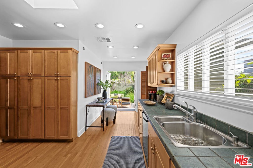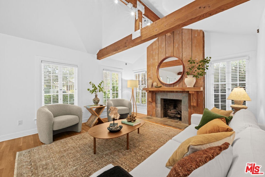 This 3-bedroom, 2-bath Colonial Revival in the Spaulding Square HPOZ is a true timeless treasure. With its distinctive gable window at the roofline, it perfectly merges classic charm with modern-day updating. The main living area is a showstopper, boasting vaulted ceilings, rustic wood beams and accents, a clerestory window, and a classic Craftsman built-in sideboard framed by a gently bowed wall of windows - a lovely 1919 bungalow detail that fills the space with natural light. The dining room flows effortlessly to a cozy side patio, while the chef's kitchen opens onto an expansive deck overlooking the lush, private backyard. The roomy primary suite offers direct deck access and is complemented by two additional bedrooms and full bath. The converted garage studio adds versatility, while a whimsical fence mural adds a playful vibe to the yard. Convenient to West Hollywood, Sunset Strip, Runyon Canyon and Hollywood, this property combines classic architecture, vibrant lifestyle, and unbeatable location.