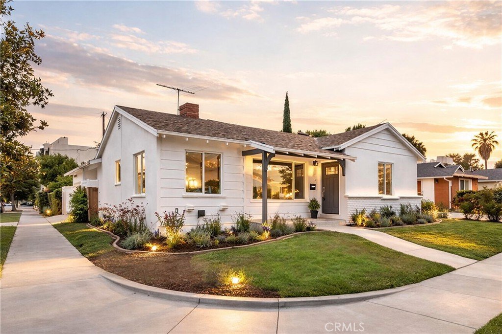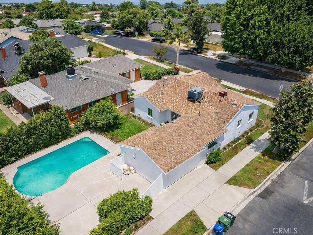Welcome to this beautifully remodeled single-story 3bedroom home on a desirable corner lot in Van Nuys. Bright and open, the home features recessed lighting, new flooring, and a statement floor-to-ceiling stone fireplace. The updated kitchen showcases shaker cabinetry, quartz countertops with a matching backsplash, and built-in stainless steel appliances. All three bedrooms are generously sized with ample closet space, and the primary suite offers a walk-in closet and an en-suite bath with a dual sink vanity and sleek glass walk-in shower. Outside, enjoy a private backyard retreat complete with a sparkling pool ideal for summer gatherings. A charming breezeway patio with access from both the kitchen and primary suite creates a private outdoor sitting area, perfect for morning coffee. The detached 2 car garage offers incredible ADU potential with its own separate entrance, plus additional space to expand, an excellent opportunity for future rental income or multi generational living. This turnkey property blends comfort, style, and investment potential in one exceptional package.