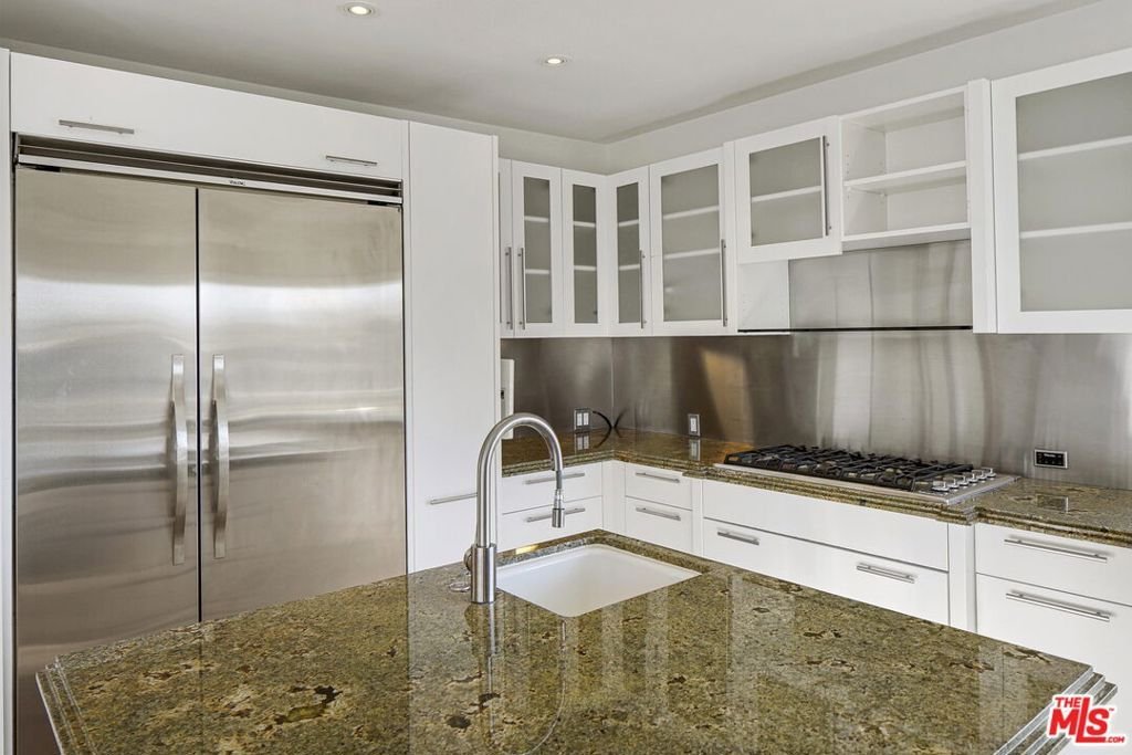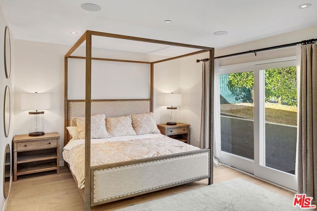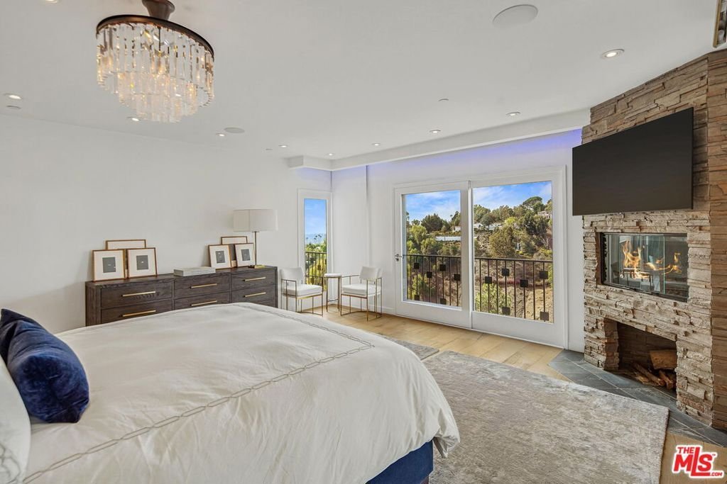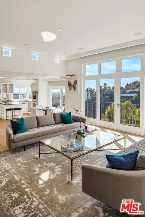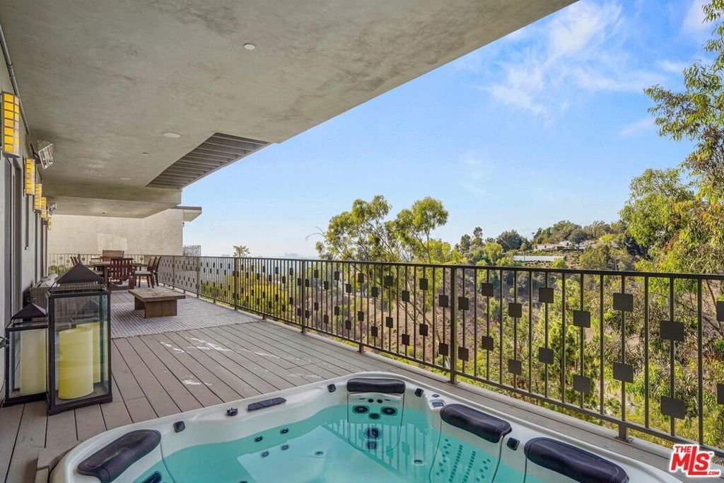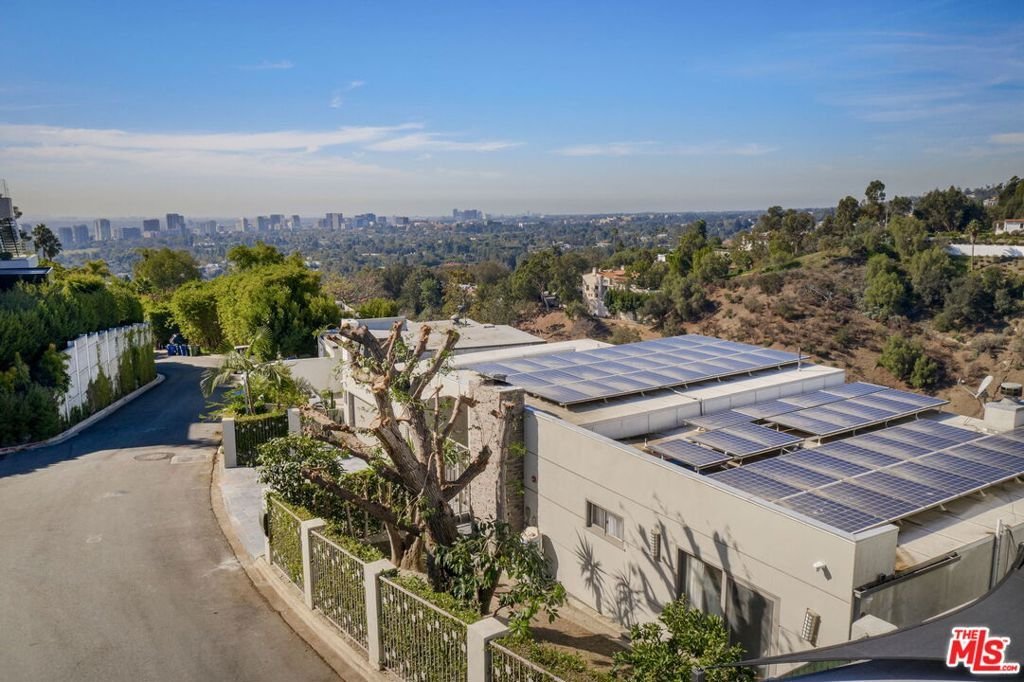 Perched on a scenic hillside in coveted Lower Beverly Hills Post Office, this beautifully renovated four-bedroom contemporary home offers breathtaking panoramic canyon, city, and ocean views just minutes from the heart of Beverly Hills. Designed to maximize natural light and indoor-outdoor living, oversized windows across multiple levels frame stunning vistas and create a bright, airy atmosphere throughout the home. The main level great room features a spacious living area with a gas fireplace and private view balcony, seamlessly flowing into a sunlit dining space and a modern chef's kitchen. The kitchen is outfitted with high-end Viking and Miele stainless steel appliances, granite countertops, and a seated center island, making it ideal for both everyday living and entertaining. The lower level offers an expansive family room with a state-of-the-art home theater system, opening directly to a large outdoor deck with a built-in jacuzzi, ideal for relaxing or hosting gatherings while enjoying the spectacular canyon and sunset views. Three bedrooms are located within the main residence, including a lower level suite with direct access to the deck and a luxurious primary suite complete with a walk-in closet and spa-inspired bathroom featuring a double vanity, soaking tub, and steam shower. A separate guest suite or private office with its own entrance, along with an additional storage room, provides flexible space for guests, work-from-home needs, or creative use. Fully remodeled with modern conveniences, the home includes smart home automation, Nest thermostats, built-in surround sound throughout, and energy-efficient solar panels. An attached two-car garage and spacious driveway present ample off-street parking, adding to the home's functionality. Ideally located just minutes from Rodeo Drive, world-class shopping, fine dining, and top Beverly Hills amenities, 1433 Summitridge Drive offers a rare combination of privacy, luxury, and sweeping views in one of Los Angeles' most desirable neighborhoods.