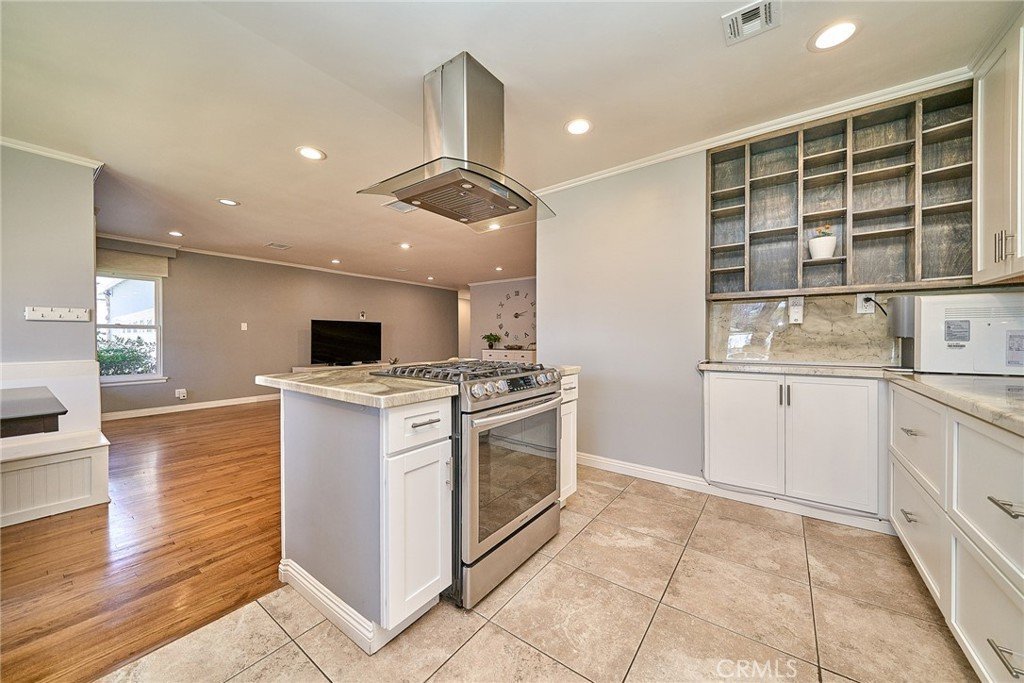 This home showcases a bright open floor plan with effortless flow between the living, dining, and kitchen and to the bedrooms. Elegant features include hardwood flooring, recessed lighting throughout, and a stylish chef’s kitchen complete with deep drawers, self-closing cabinetry, a farmhouse sink, and an island with a built-in range and suspended hood.