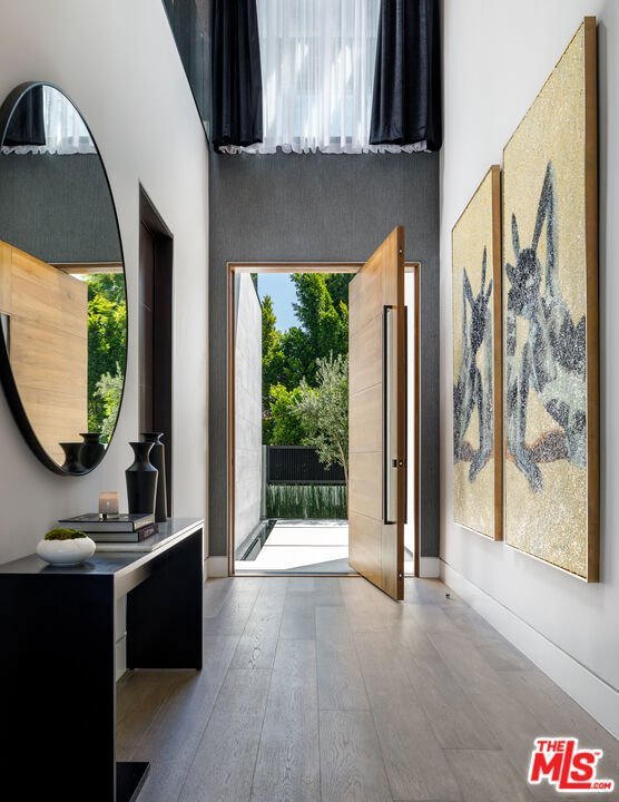 In one of Bel Air's most prestigious enclaves, this warm modern masterpiece by Ramtin Ray Nosrati captures sweeping vistas that span city lights, ocean horizons, and canyon ridgelines. A grand, light-filled floor plan unfolds with bespoke flooring, sculptural lighting, and expansive Fleetwood walls of glass that recede to create a seamless dialogue between indoors and out. The gourmet kitchen is a study in quiet refinement, wrapped in rich wood and marble, and appointed with top-tier appliances, dual ovens, wine refrigeration, and an oversized island with breakfast bar. Just beyond, a striking glass-bottom infinity pool spills gracefully into a lower-level waterfall, an intentional moment that anchors the home with serenity and visual intrigue. Five-star amenities include a sumptuous primary suite with private terrace, beautifully appointed guest accommodations, a dual-sided tropical fish aquarium, indoor waterfall, formal dining room, and multiple fireplaces that lend warmth throughout. Gated grounds and lush, layered landscaping frame a series of outdoor living spaces designed for both privacy and repose. Created with the consummate entertainer in mind, the lower level reveals a suite of extraordinary amenities, including a luminous onyx bar, a state-of-the-art theater with fiber-optic star ceiling, an immersive video wall, fitness studio, and a temperature-controlled wine cellar. A rare architectural work of art set within one of Bel Air's most coveted addresses.