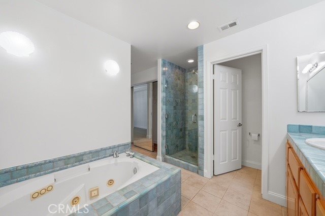 The spacious primary suite features a thoughtfully designed en-suite bathroom with a closet, dual sinks, a soaking tub, a separate walk-in shower, and a private commode. A walk-through closet conveniently connects the bedroom to the bathroom for added functionality.