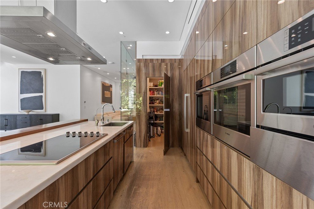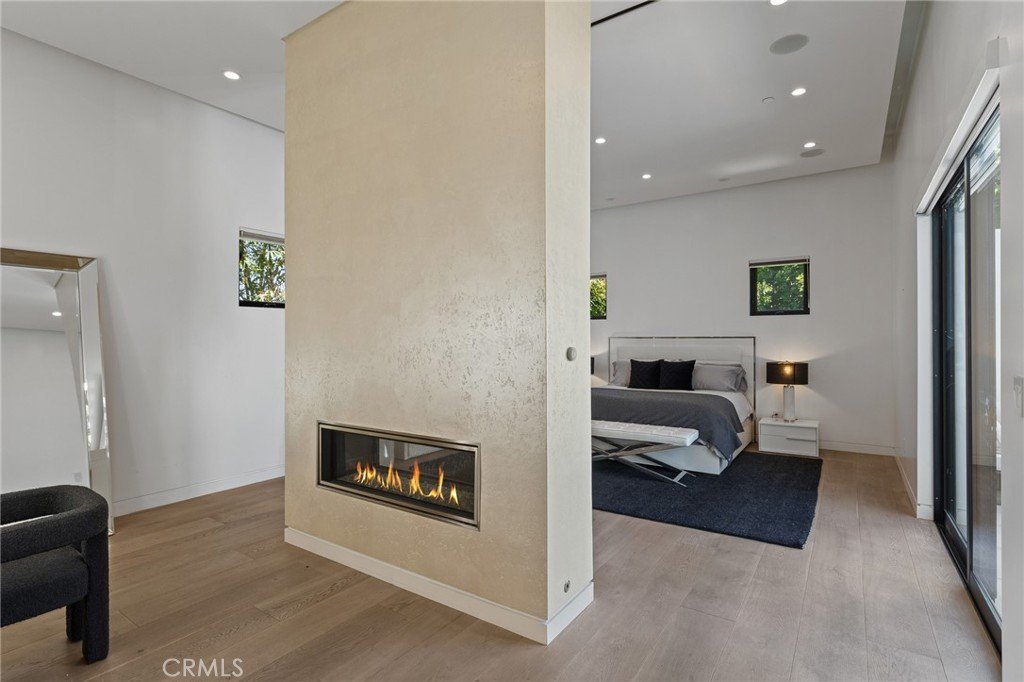 Soaring ceilings and walls of glass fill the interiors with natural light, seamlessly connecting the open-concept living, dining, and chef’s kitchen. The kitchen features premium Bosch and Viking appliances, custom cabinetry, a walk-in pantry, and a striking Calacatta marble island, complemented by a sleek glass-enclosed wine display and double-sided fireplace.