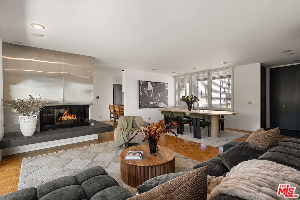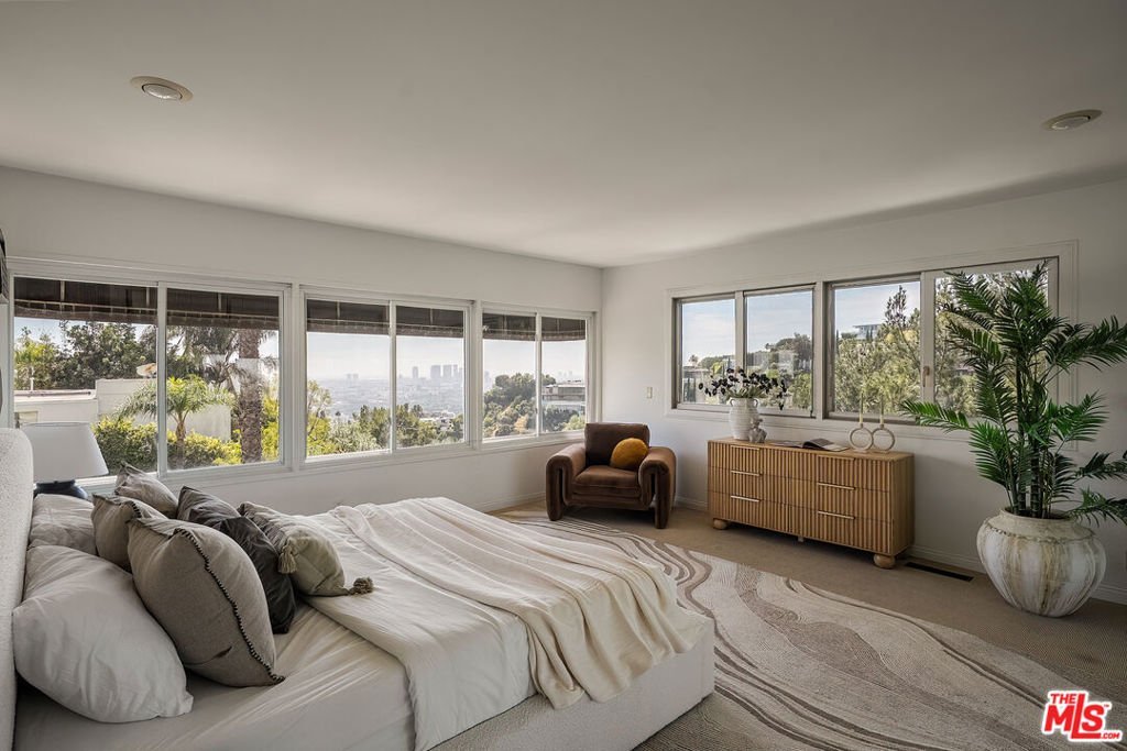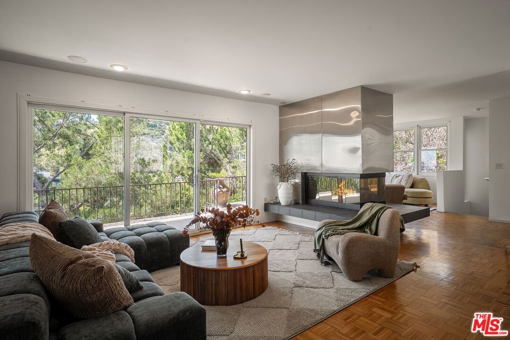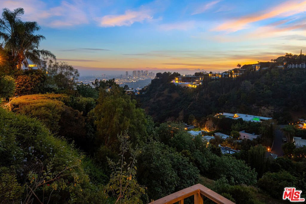 Perched on a quiet cul-de-sac above the Sunset Strip, this striking mid-century estate captures sweeping panoramic city views stretching across Century City and beyond. The residence offers a rare blend of privacy, character, and iconic Los Angeles vistas. The home is anchored by a dramatic living room featuring a stately double-sided stainless steel fireplace, an architectural centerpiece that reflects the era's bold, modernist sensibility. Parquet wood floors add warmth and character, while walls of glass frame the skyline and invite natural light throughout. Designed for quintessential indoor-outdoor living, the expansive yard features a swimmer's kidney pool set against a backdrop of glittering city lights. The primary suite is ideally positioned to take in jetliner west-facing views, delivering striking sunsets and a true sense of elevation above the city. A compelling opportunity to preserve and enhance a classic mid-century property or reimagine it into a modern architectural statement, this offering combines location, views, and design pedigree in one of the Hollywood Hills' most coveted settings.