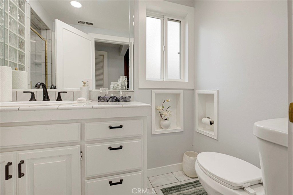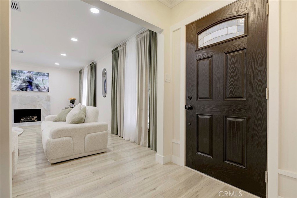 The home features 3 bedrooms and 3 bathrooms, including one recently fully remodeled bathroom. Interior highlights include laminate flooring throughout, recessed lighting, central HVAC, a cozy fireplace with custom stone surround, and a mini bar—perfect for entertaining.