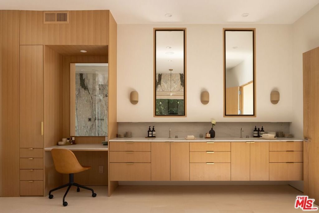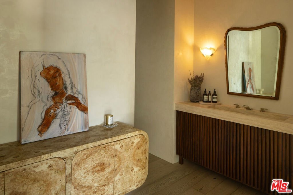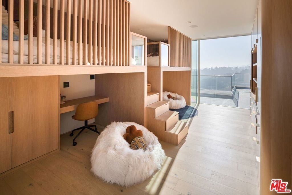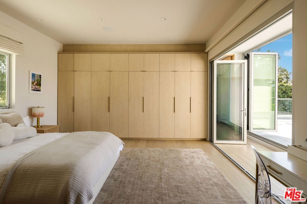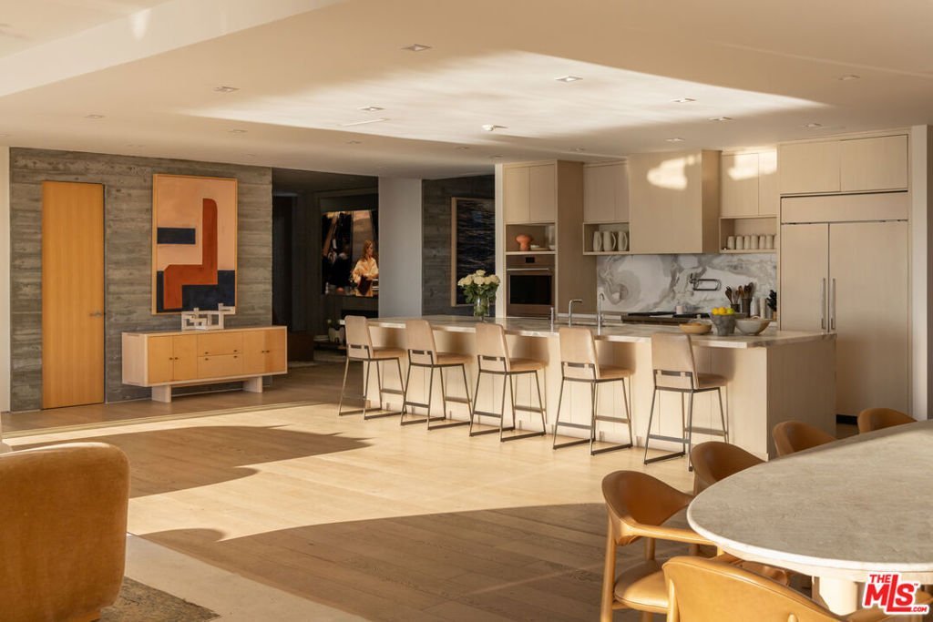 Set behind private gates and approached through a stone motor court lined with majestic olive trees, the residence opens to a wide glass pivot door that immediately frames unobstructed views stretching from Century City to the Pacific. Just inside, a living olive tree anchors the entry, blurring the boundary between architecture and landscape, and establishing a warm, organic thread that carries throughout the home. The main level is designed for both entertaining and ease with contemporary interiors by famed designer Bridgette Romanek. A moody theater room finished in custom wood paneling centers around a striking, floor-to ceiling travertine fireplace with a concealed, drop down projection screen, and connects to a more intimate family room that features a built-in bar. A stunning powder room serves the level, while the kitchen is designed to a true chef's standard, outfitted with top-tier appliances and a layout that supports both function and flow. Adjacent, a glass-enclosed, temperature-controlled wine room acts as a visual centerpiece to the formal dining area. The formal living and dining areas are anchored by a dual-sided fireplace and open fully to the exterior. Just beyond, a covered lounge sits adjacent to the pool, extending the main living spaces into the expansive outdoors. A glass-encased staircase leads to the upper level, where clean, uninterrupted walls provide a natural gallery setting. The primary suite is positioned to take full advantage of the explosive views, with a large balcony and a separate sitting lounge with fireplace overlooking the grounds. The luxuriously-appointed bathroom is finished with a soaking tub, steam and rainfall shower, vanity, and a walk-in closet. Two additional bedrooms complete the upper level, including a custom-designed children's room with elevated twin beds and integrated desks. The lower level offers three additional rooms, providing flexibility in use: a guest bedroom, a playroom that can be reconfigured into two separate rooms, and a flex space equipped with a Murphy bed. A dedicated laundry room completes this level. Surrounded by meticulous landscaping, the home offers complete privacy with interiors defined by warm materials, clean lines, and carefully considered finishes. All of this, just minutes from the shopping, dining, and nightlife of Beverly Hills, yet positioned to feel entirely removed.