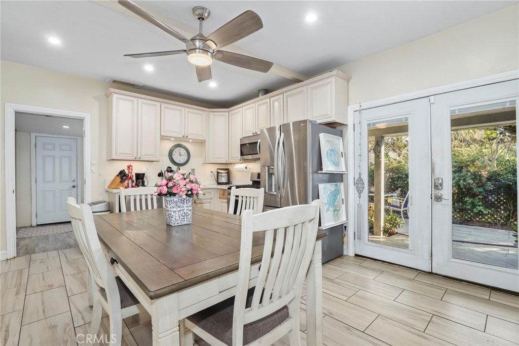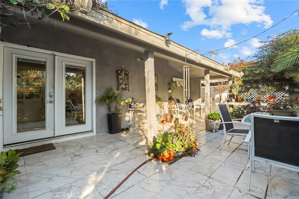 French doors open to a private patio, ideal for entertaining, backyard barbecues, or enjoying morning coffee. Two spacious bedrooms share the updated bathroom, while the laundry/office area offers direct access to a rear walkway leading to the detached two-car garage, perfect for parking or additional storage. Additional highlights include a private driveway accommodating two or more vehicles with an awning that provides shade during warm summer days. Lush, mature landscaping surrounds the property, offering privacy and a tranquil, retreat-like setting.