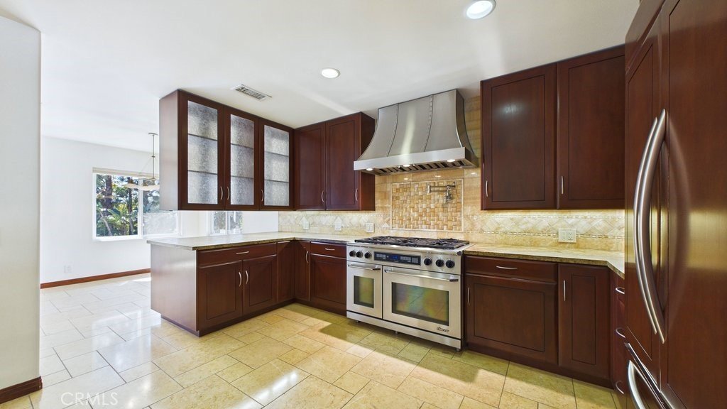 The gourmet kitchen has been thoughtfully updated with custom cabinetry, stone countertops, premium appliances, and a professional 6-burner stove with a convenient pasta arm faucet, making it ideal for cooking enthusiasts. Ample cabinetry provides generous storage throughout the kitchen.