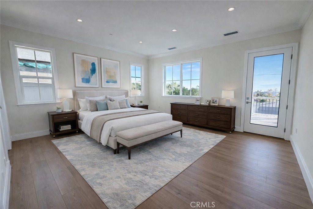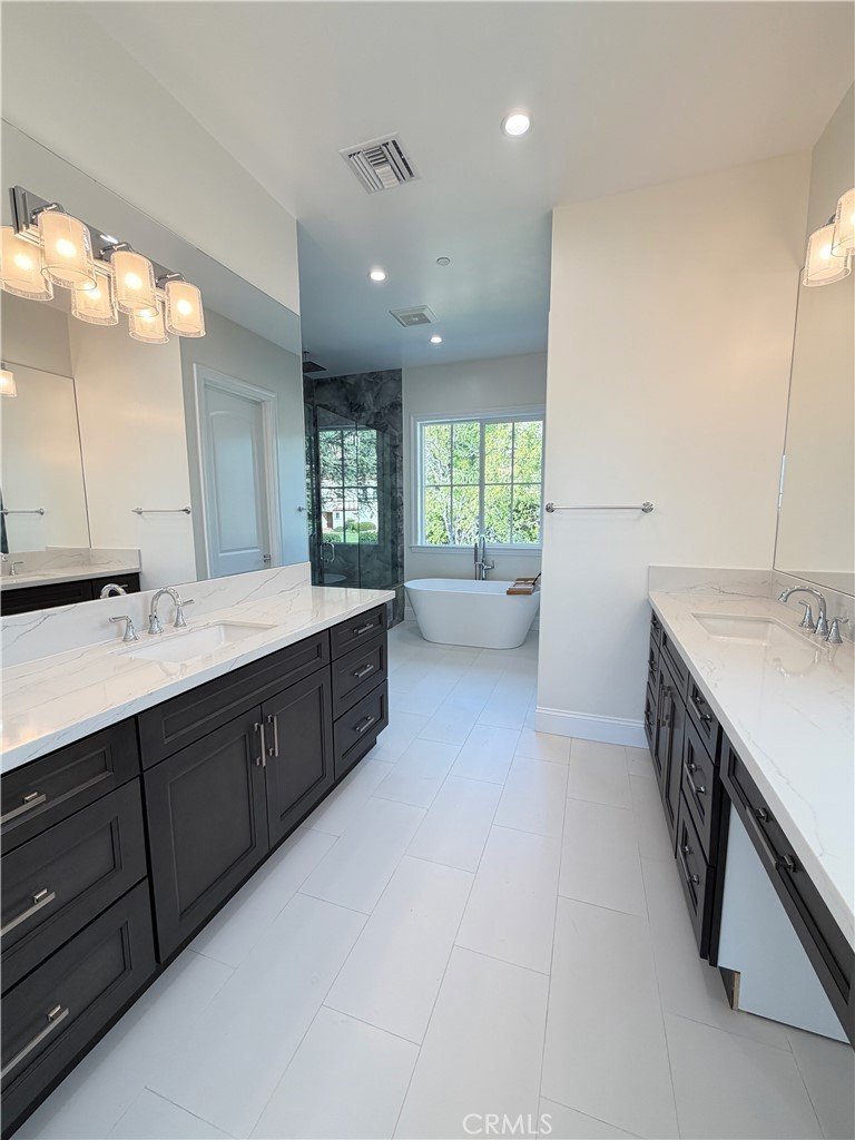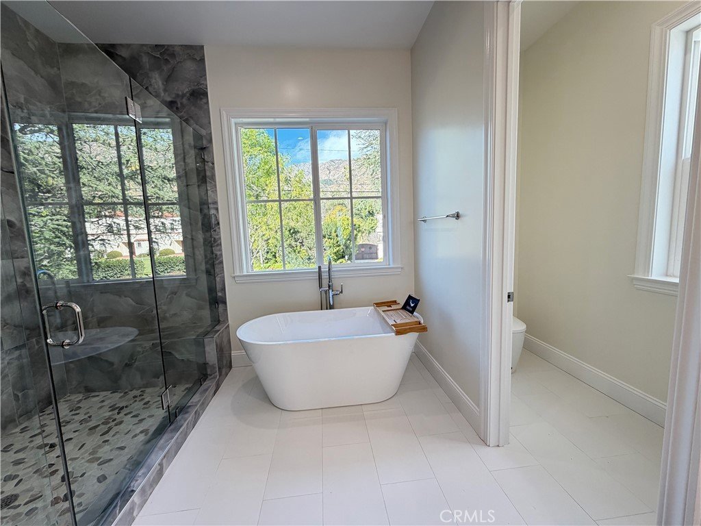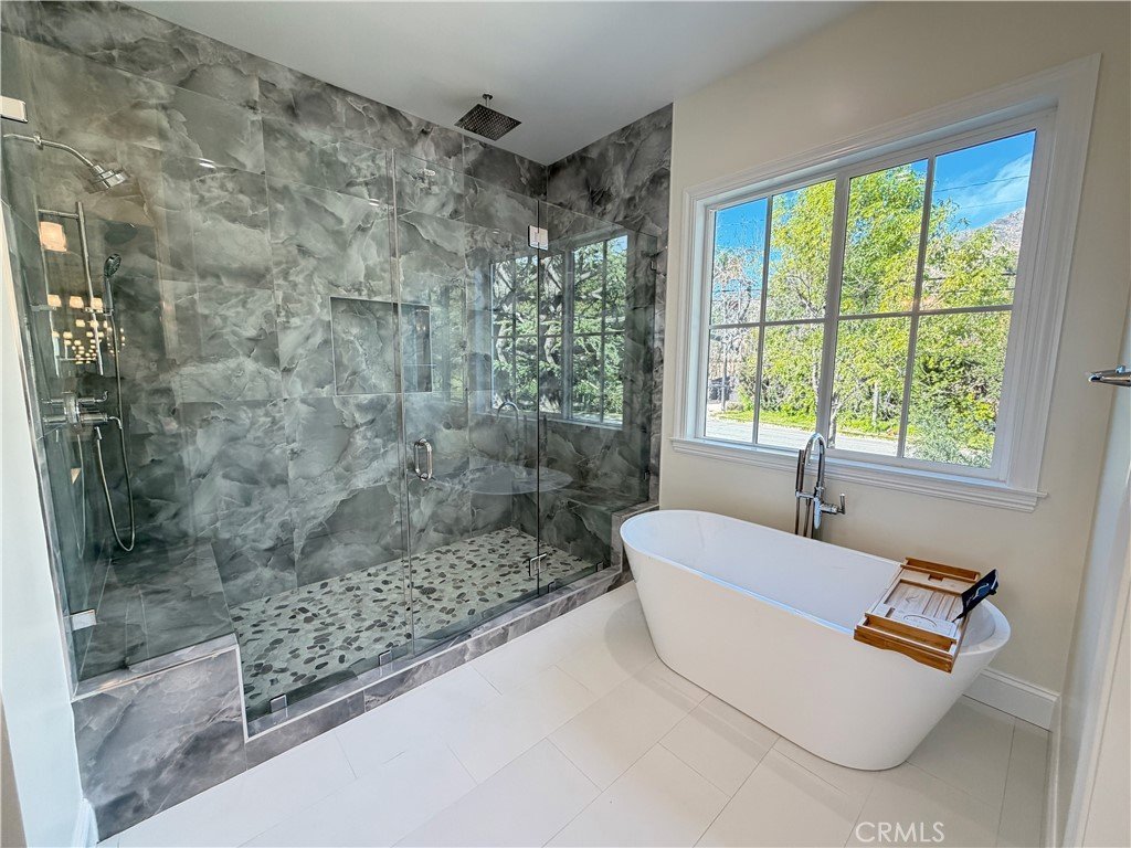 Welcome to this exceptional transitional Craftsman residence, meticulously rebuilt following the 2025 Eaton Fire with an emphasis on modern efficiency, safety, and refined living. The home is fully electric and energy-efficient, featuring owned solar panels with battery storage and separate HVAC systems for each level to ensure optimal comfort year-round. The interior offers a thoughtfully designed open-concept floor plan with recessed lighting, waterproof vinyl flooring, and dual-glazed thermal windows throughout. The kitchen is equipped with quartz countertops, solid wood cabinetry, LG appliances, a double oven, a spacious island with bar seating, and a wet bar with a built-in beverage center. A large walk-in pantry provides abundant storage, while built-in surround sound enhances the kitchen, family room, and dining areas. The formal living room is distinguished by high ceilings, an electric fireplace, and custom built-in shelving and cabinetry. A solid wood staircase with wrought-iron detailing adds architectural elegance and leads to a gallery. Bathrooms are finished with scratch-resistant porcelain tile, bidet toilets, built-in handheld fixtures, and frameless or semi-frameless glass enclosures. One upstairs bathroom includes a bathtub well-suited for families, while the primary suite features a spa-inspired bathroom with a freestanding soaking tub and a rainfall shower with handheld. All bedrooms are pre-wired for televisions and include closets with built-in shelving. The primary suite offers two walk-in closets, one featuring a center island, 2 separate vanities in the master bath and balcony access. The detached garage is equipped with an electric vehicle charging port and is complemented by an adjacent ADU with separate power metering and its own laundry hookups, ideal for guests, rental income, or extended living. The front and rear grounds are professionally landscaped with drip irrigation, uplighting, and designated space for a garden. For enhanced security and peace of mind, the home is pre-wired for security cameras, includes a built-in alarm system, fire sprinklers, and fire-resistant siding. Block fencing borders the sides, and newly installed wrought-iron fencing with maturing ficus trees enhances privacy in the backyard. Situated in a neighborhood undergoing active revitalization, with many surrounding properties already under reconstruction, this home presents an opportunity to be part of a forward-progressing community.
