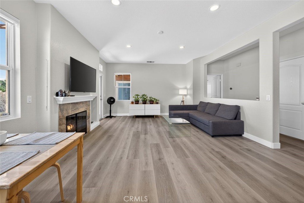Inside, a spacious living room is filled with natural light, highlighted by large windows and a cozy fireplace. The remodeled kitchen features elegant quartz countertops, stainless steel appliances, and abundant cabinetry, offering both style and functionality. The open layout flows seamlessly to your private patio, perfect for morning coffee or evening relaxation.