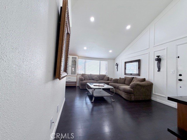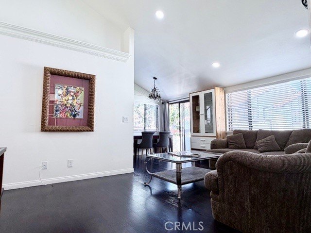 The bright and airy living space features soaring vaulted ceilings, recessed lighting, and abundant natural light, creating an open and inviting atmosphere ideal for both everyday living and entertaining. Wood-style laminate flooring flows throughout the home.