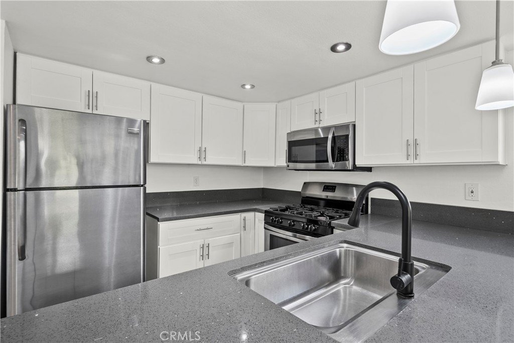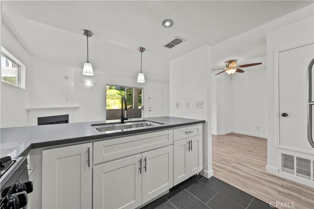 The updated kitchen features white shaker cabinets and quartz countertops along with clean modern finishes. The layout works well for everyday living and connects nicely with the living and dining areas, which creates an open and functional space.
