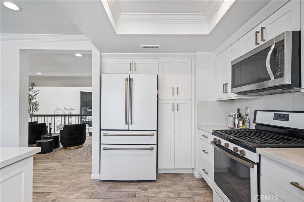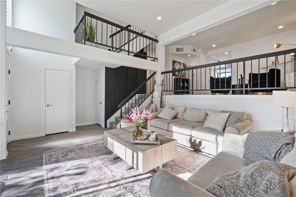 Stylish and spacious 3-bedroom, 2.5-bath residence ideally located near shopping, dining, and conveniences. The open split-level layout features a bright living room with soaring vaulted ceilings, an elegant black-accent fireplace wall, and wide-plank flooring flowing to a private front patio overlooking the community pool. The remodeled kitchen showcases shaker cabinetry, quartz countertops, brass hardware, and stainless appliances, opening to a chic dining area with plantation shutters. The primary suite offers dramatic vaulted ceilings, a custom accent wall, and a beautifully remodeled bath with dual marble vanities. Additional highlights include crown molding, recessed lighting, and a direct-access two-car garage. Located within the highly rated Palos Verdes School District, this home combines quality, comfort, and incredible Peninsula value.