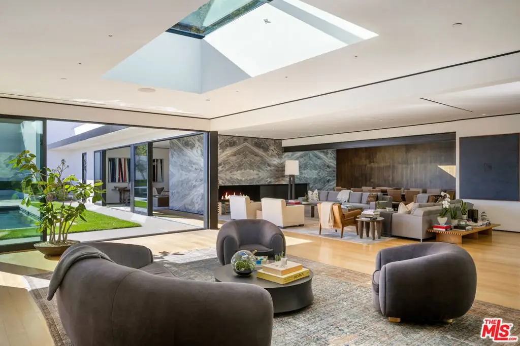 Tucked away in the prestigious Bird Streets, this private contemporary compound blends refined design with absolute privacy. Thoughtfully reimagined by the renowned AD100 firm Clements Design, the residence spans over 8,000 square feet on a generous 23,100-square-foot lot, offering a seamless indoor-outdoor lifestyle framed by sweeping city views through disappearing walls of glass.Light-filled living spaces include an airy great room with a striking fireplace and skylights that enhance the home's serene atmosphere. The chef's kitchen is equally impressive, outfitted with Miele appliances, an oversized island, WineMate-cooled wine wall, and a full butler's pantry.The primary suite is a calming retreat with a fireplace, motorized shades, direct access to the yard, and a spa-inspired bath featuring a soaking tub, glass-enclosed steam shower, and a custom walk-in closet. Designed for entertaining, the outdoor areas include an 80-foot pool with a dramatic marble waterfall, spa, multiple lawns, and a tiered deck with a thriving vegetable garden by Heart Beet Gardening. The lower level features a private guest suite, gym with separate entry, home office, and a state-of-the-art theater with lounge and bar. Additional highlights include a library with floating walnut shelves, secondary lounge with built-in bar, Crestron smart home system, and a resurfaced garage. Moments from the Sunset Strip and Beverly Hills, this one-of-a-kind estate offers the ultimate blend of luxury, privacy, and access to the best of Los Angeles.