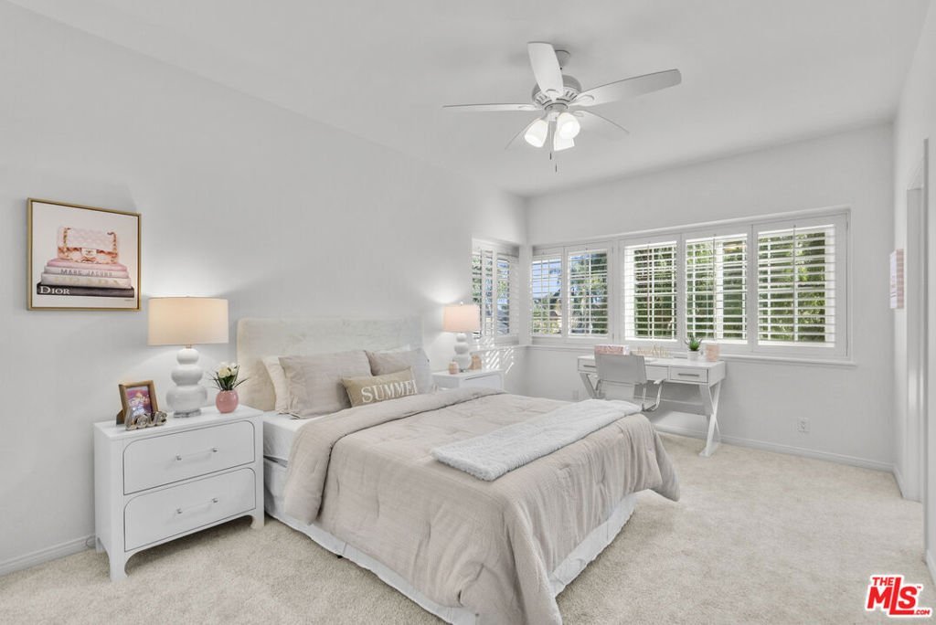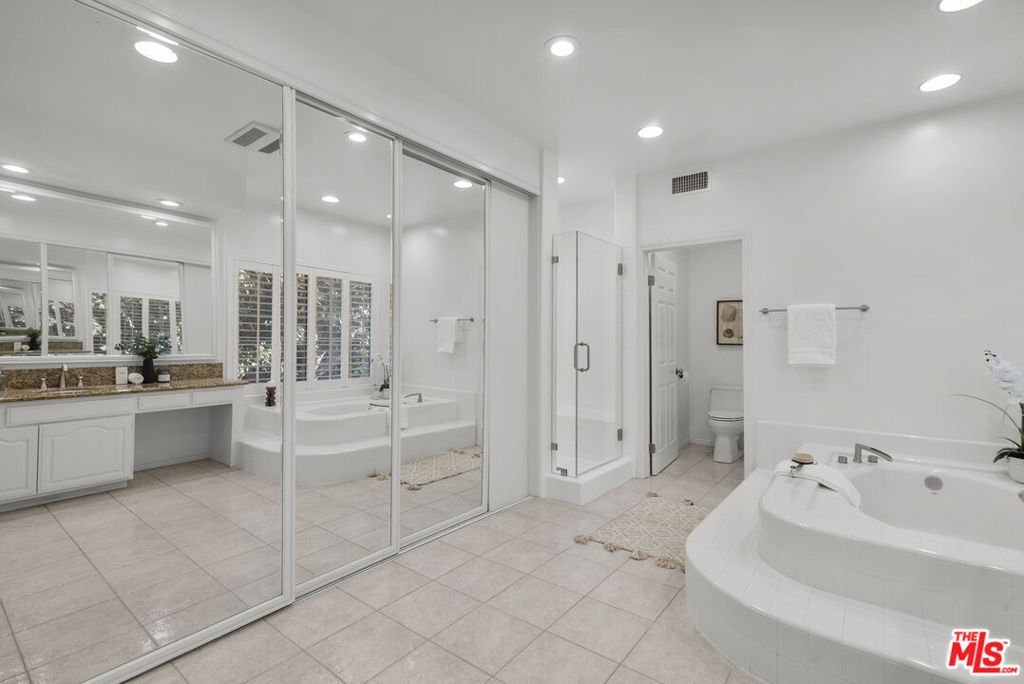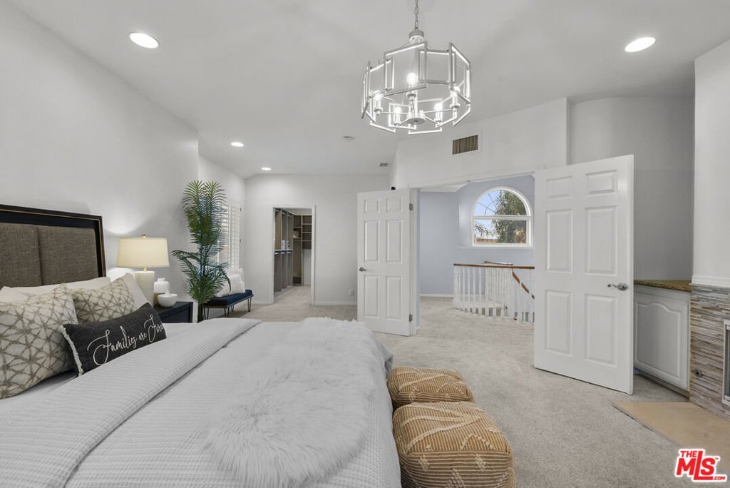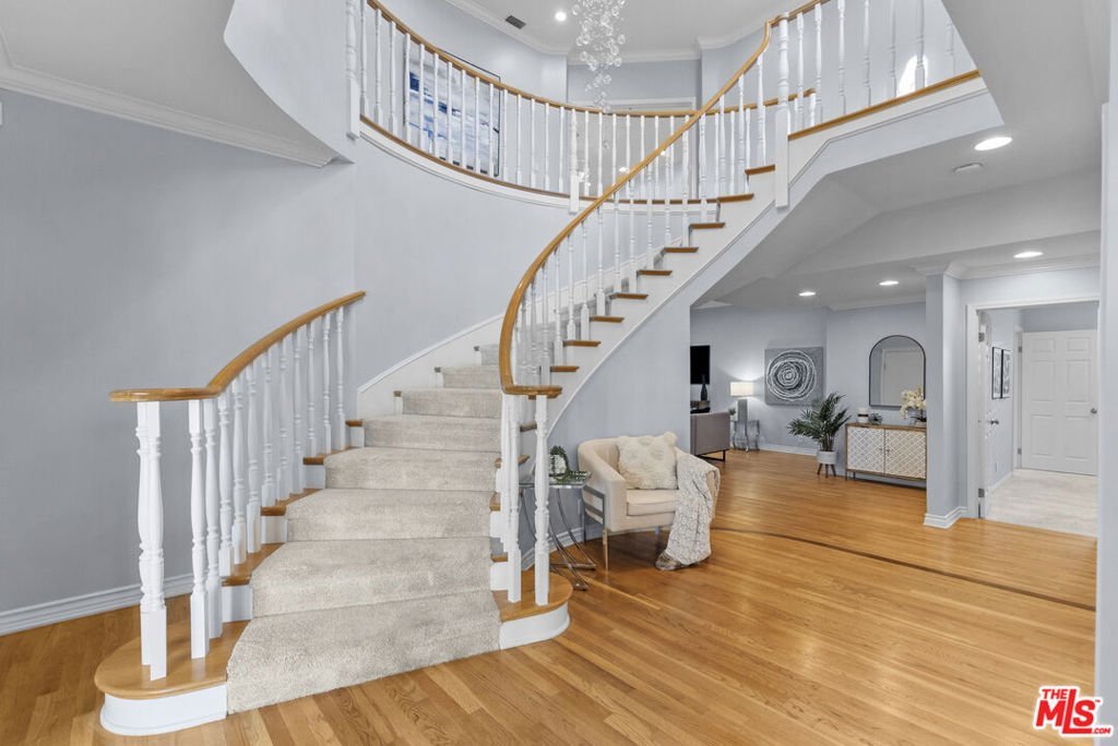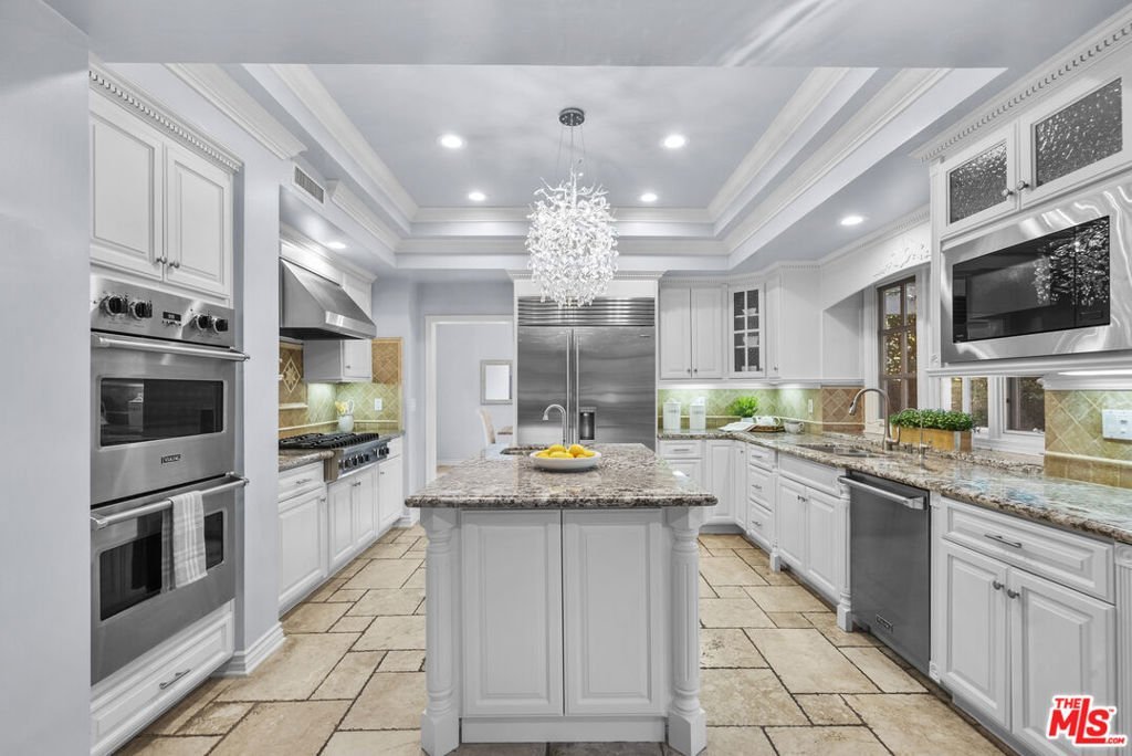 Behind the gates of one of Porter Ranch's most sought-after communities, this private pool residence delivers an exceptional blend of space, comfort, and carefully curated upgrades for effortless everyday living. Set on a 12,308 sq ft corner lot, the home welcomes you with a half-moon circular driveway, mature palms, and inviting curb appeal. The traditional two-story floor plan spans 3,717 sq ft with 5 bedrooms and 4.5 bathrooms. Step inside to a bright entry highlighted by a crystal raindrop chandelier that creates an elegant first impression. Just beyond is the ample sized living room pre-wired for in-wall surround sound for a theater like entertaining or quiet evenings at home. Adjacent is the remodeled kitchen that is both functional and welcoming. Custom granite countertops, abundant cabinetry, and a large center island provide generous workspace, while a walk-in pantry offers substantial storage. LED recessed lighting brightens the space, and a built-in water filtration system adds everyday convenience. All kitchen appliances were replaced in December 2022 and include a full Viking suite and Sub-Zero refrigerator. A sunny breakfast area overlooks the yard and opens to the patio, making indoor-outdoor living feel effortless. From here, the layout flows naturally into the separate dining room, an ideal space for hosting gatherings or holiday meals. A separate formal living room rounds off the first level anchored by a fireplace, French doors, and full of natural sunlight. Tucked away on the main level is a private en-suite bedroom, ideal for guests, extended family, or a quiet home office. Upstairs, the primary suite offers generous proportions and space for an exceptional wardrobe with two closets, including a large custom walk-in. The spacious bath features a soaking tub, separate shower, large vanity, and ample room to unwind. Additional bedrooms are generously sized and well arranged, including one private en-suite and two bedrooms connected by a convenient Jack-and-Jill bathroom. Throughout the home, smart technology enhances comfort and peace of mind. Dual A/C systems are paired with Nest thermostats on each level. A Nest doorbell, Nest smoke and CO detectors, and ADT door and window sensors provide added security. Systems are app-controlled for convenient management, and a rooftop cell extender strengthens signal coverage across the property. The oversized three-car garage includes ultra-quiet LiftMaster openers with integrated cameras and 360-degree lighting. The living spaces extend seamlessly outdoors to a backyard designed for year-round enjoyment. A pebble-tech pool and spa serve as the centerpiece, supported by updated Pentair equipment installed within the last five years. Dual pumps, a heater, automated chemical dispensers, a wireless control panel make operation simple and reliable. Mature landscaping enhances privacy controlled by Rachio smart sprinkler system that manages irrigation from your phone while you enjoy the multiple seating areas that invite relaxation. Outdoor amenities include a built-in BBQ, a half-court basketball area, and a rear patio pergola newly replaced in summer 2025. With a thoughtful balance of formal entertaining spaces, comfortable everyday living areas, and extensive modern upgrades, this home offers privacy, functionality, and resort-style features in one of Porter Ranch's most desirable gated communities. Conveniently located near top-rated schools and the Northridge Fashion Center, it presents an exceptional opportunity to call Porter Ranch home.