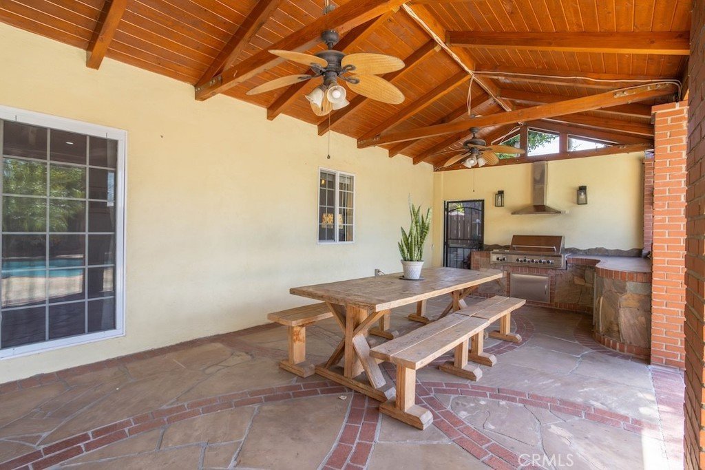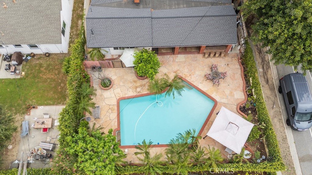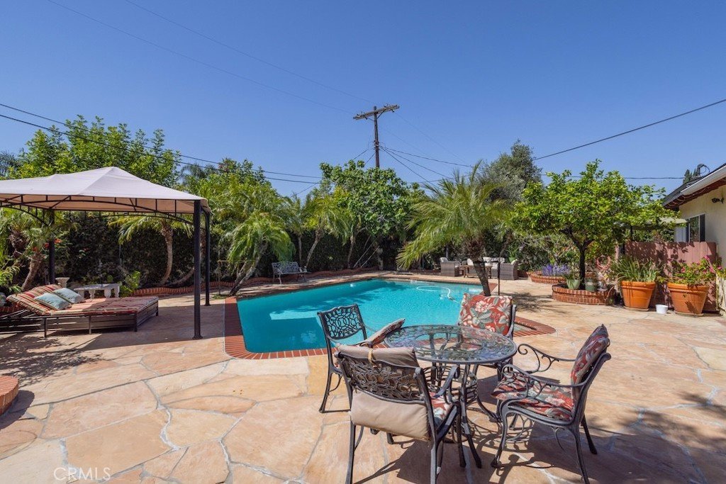 Welcome to this stunning Northridge residence, a 3 bedroom, 2 bathroom home that perfectly blends elegance, comfort, and functionality. Situated on a desirable corner lot, the property is fully fenced with stately red brick pillars and decorative iron gates. Automatic gates open to a secured flagstone driveway and lead to the spacious, finished 2-car garage. The corner location offers ample street parking and the convenience of two separate entryways. Step inside to be greeted by an inviting open concept design that effortlessly connects the kitchen, formal dining area, and living room. Warm, wood-like flooring flows throughout, creating a cohesive and welcoming atmosphere. The updated kitchen is a chef’s delight with granite countertops, built in ovens, and a versatile island ideal for casual dining or entertaining. The living room, anchored by a cozy fireplace, opens directly to the backyard oasis. Off the kitchen, you’ll find a laundry area and an updated full bathroom, perfect for guests or extended family. Down the hall are three generously sized bedrooms and another modern full bath. The primary suite is bathed in natural light and features dual closets for abundant storage. Adjacent to the formal dining area is a permitted living room flex space currently transformed into a charming studio. This versatile area boasts vaulted wood beam ceilings, Spanish tile floors, a kitchenette, private bathroom, and its own separate entry, along with a private patio accessible via the side yard. This space is ideal for extended family, a home office, or easy conversion back to a living room. The backyard is a true entertainer’s paradise. It features a sparkling pool, soaring wood-beam patio cover, and flagstone flooring throughout. Enjoy a built-in BBQ with an exhaust fan, a stone island with bar stools, multiple seating areas, raised planters, mature trees, and accent lighting that brings the space to life in the evenings. Whether hosting summer parties or enjoying quiet evenings, this backyard is the perfect retreat. This Northridge gem combines versatile living spaces, thoughtful updates, and a backyard designed for year round enjoyment offering the ultimate California lifestyle. Close proximity to shopping at the Northridge Fashion Center that houses Portos, EoS Fitness (formally Golds Gym), Apple Store, AMC Theaters, Yard House, and Northridge Farmers Market to name a few. Amazing location, close to Cal State Northridge and major freeways.