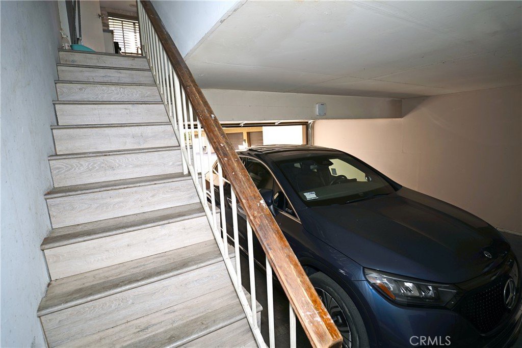 A direct stairway from the kitchen leads down to the attached private garage, offering convenient access. The garage includes in-garage laundry and an electric vehicle charging outlet, ideal for Tesla or other EV owners, along with additional storage space.