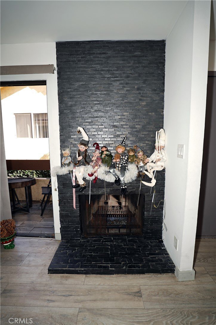 The living area features contemporary flooring, recessed lighting, a custom accent wall that adds character and style. and a striking floor-to-ceiling stone fireplace, creating a perfect focal point for relaxing or entertaining. Sliding doors open to a private patio, ideal for morning coffee or evening wine.. A staircase from the main living level leads to the second floor, where the bedrooms are located, providing excellent separation of living and private spaces.