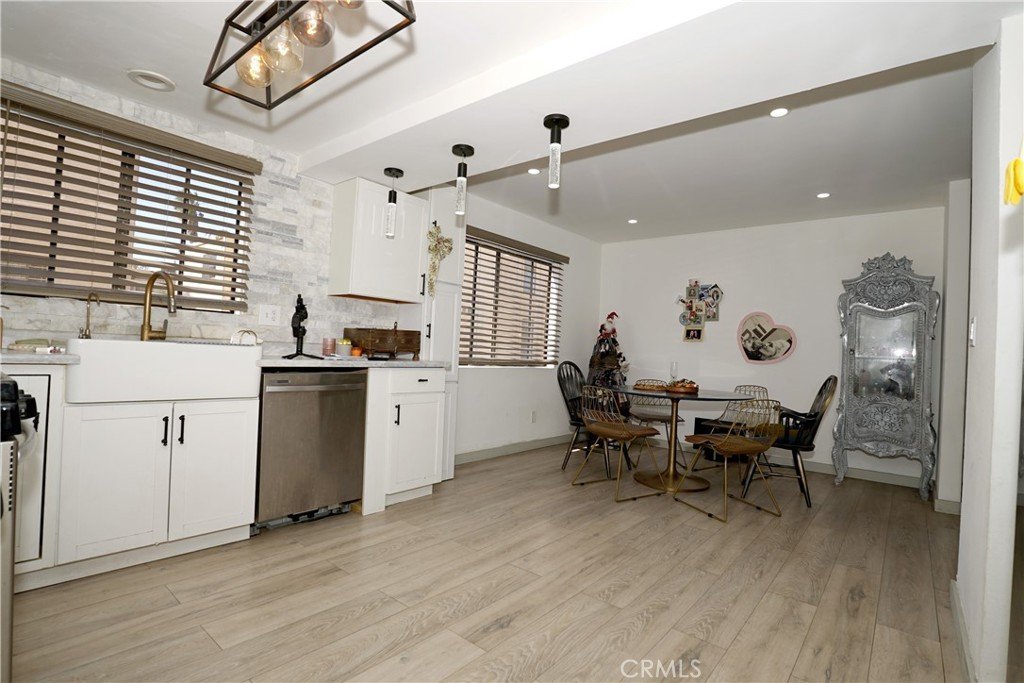 The unit features a private entry accessed via a short exterior staircase leading to an open and airy floor plan filled with natural light. The living, dining, and kitchen areas flow seamlessly, creating an ideal space for everyday living and entertaining. The updated kitchen showcases sleek white cabinetry, stainless steel appliances, pendant lighting, elegant porcelain countertops, and a complementary tile backsplash. Durable wood-style flooring runs throughout the main living areas, adding warmth and cohesion.