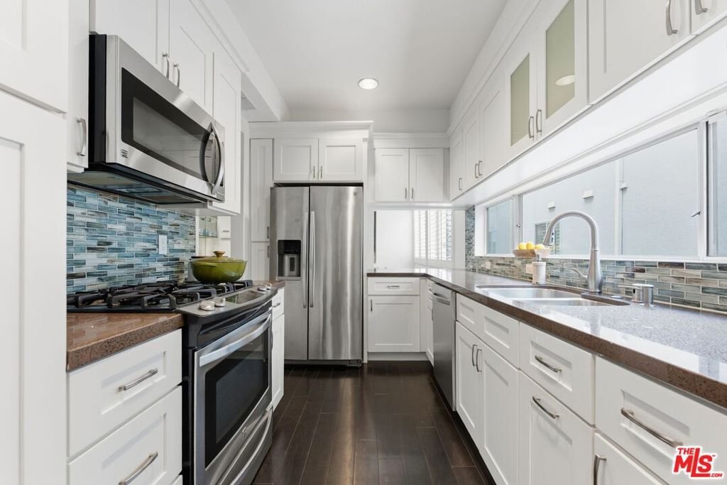 Nestled in a prime & central location, this one story 2-bedroom, 2-bathroom condo effortlessly combines modern updates with a sense of tranquility. Floor-to-ceiling windows frame the living room, offering treetops views on the east and north sides, bathing the space in soft, filtered light, especially during the morning. It's the perfect space to greet the day and come home to. .The updated kitchen boasts sleek newer cabinets, countertops, and appliances, making it as functional as it is stylish. The formal dining room provides flexible options whether you're hosting dinner parties, setting up a home office, creating a playroom, or carving out a family TV room. The primary bedroom is a true retreat, complete with a cozy fireplace, a generous walk-in closet, and plenty of room for a sitting area or desk. The ensuite bathroom features a new soaking tub, separate glass enclosed shower and duel vanity sinks. The 2nd bedroom also features lots of storage space. Both bedroom closets are designed with the Elfa modular system maximizing both space and storage. The second bathroom is full-sized, ideal for guests or family use. Conveniently located just off Westwood Boulevard and around the corner from the ever-popular House of Bread! Close to UCLA, Century City, and with easy access to the 10 freeway, this condo offers unbeatable accessibility to some of the best shopping, dining, and entertainment around. This property is within walking distance of Westwood Charter Elementary School. Move-in ready and newly painted, this home is waiting for you to make it your own!