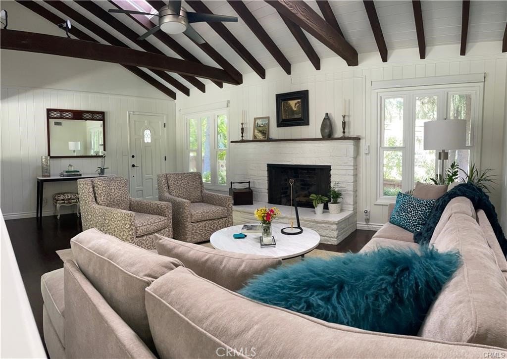 The renovated kitchen is a standout feature, showcasing premium finishes and smart design. Highlights include custom cabinetry, a spacious island with bar seating, a Wolf cooktop, solid-surface counters, and distinctive brick detailing for added character. A cozy breakfast area with a built-in workstation and an oversized walk-in pantry provide both charm and functionality. Hardwood flooring extends throughout the home, while exposed beam ceilings in the great room, dining area, and primary suite enhance the sense of space and architectural interest. The central living area is warm and inviting, anchored by a fireplace and illuminated by overhead skylights that fill the room with daylight.