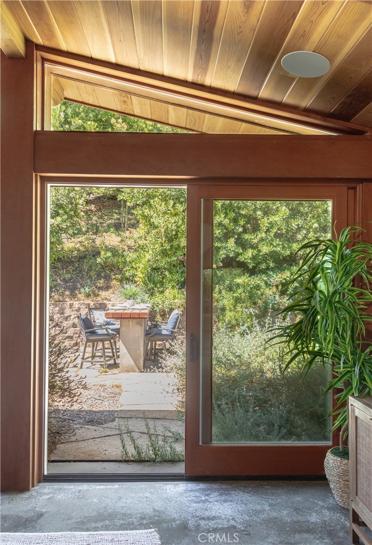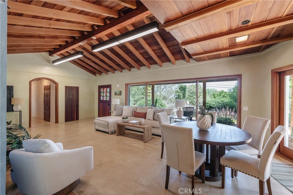 Outside is an organic food lover or vegetarian's dream. Imagine mornings spent harvesting your own fruit & evenings cooking fresh vegetables from the raised garden beds. Practice yoga on the wrap-around covered porch or BBQ & dine al fresco on one of the outdoor patios. Walk thru the thriving edible landscape of 60 mature fruit trees. Head up the hill behind the home to swing from a tree, experience fireworks across the LA basin, witness snow on the mountains, or watch sunset color the coast & illuminate Downtown skyscrapers.