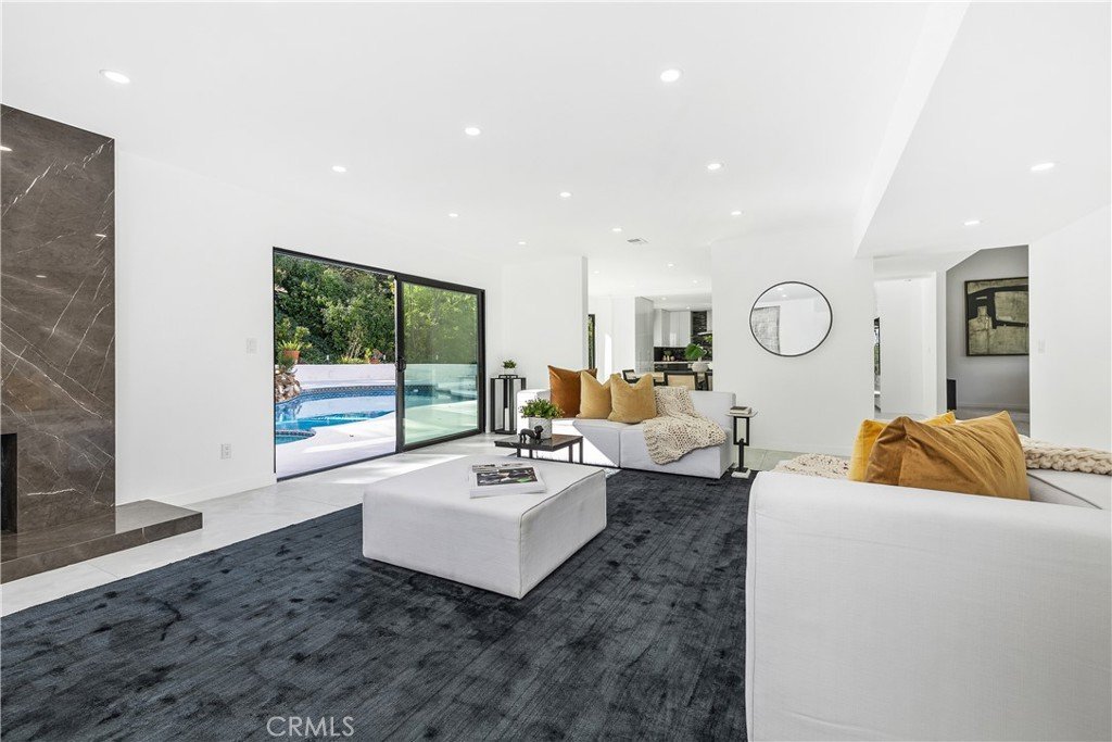 The kitchen features custom cabinetry, premium appliances, an oversized island, and a modern fireplace in the adjacent lounge area. Sliding glass doors open to the backyard, creating a connection between indoor and outdoor spaces.