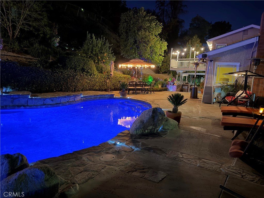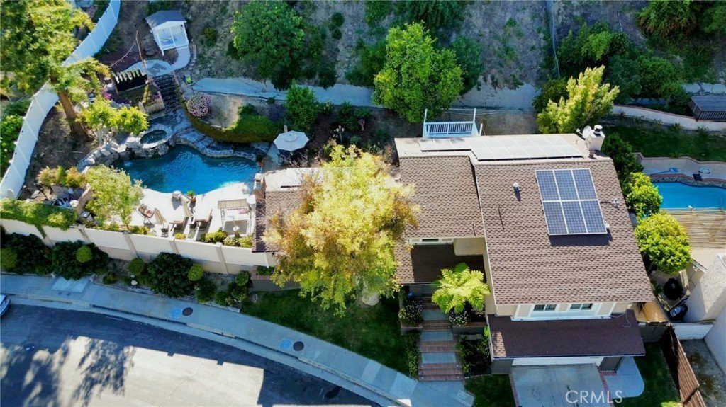 Tucked away on a quiet cul-de-sac south of Ventura Boulevard in the highly desirable Vista De Oro neighborhood of Woodland Hills, this move-in ready split-level home offers privacy, comfort, and resort-style indoor-outdoor living with pool, spa, fully paid solar, and no HOA. Surrounded by architecturally distinct homes and scenic hillside surroundings, the property features a light-filled open floor plan with soaring ceilings, wood and tile flooring, recessed lighting, and over $90,000 in upgrades. A welcoming entry opens to a vaulted living room with gas fireplace, expansive windows, and elegant light fixtures that fill the space with natural light. The kitchen features granite countertops, stainless steel appliances, a newer dishwasher, and travertine flooring. Sliding glass doors open directly to the backyard retreat, creating a seamless connection between indoor and outdoor living while providing a functional and stylish space for everyday living and entertaining. An oversized family room provides an additional gathering space with fireplace, recessed lighting, and French doors. Upstairs, the spacious primary suite offers a dual walk-in closets, a tiled shower, jetted soaking tub, dual vanities. French doors open to a private balcony overlooking the hillside, pool, and beautifully landscaped yard, adding to the sense of charm and tranquility. The backyard is designed for relaxation and entertaining, featuring a covered patio, multiple seating areas, built-in gas and charcoal barbecue, and a saltwater pool and spa with waterfall feature surrounded by mature landscaping. A charming outdoor playhouse adds character to the yard, and nearby the current owners have created an inviting outdoor movie projection area with a gas fire pit, offering a cozy setting for evening gatherings under the stars. Major upgrades include a 200-amp electrical panel, EV charger, and fully paid 10.05 kW solar system installed in 2020. The pool system has been extensively improved with a Hayward salt system, new filter, Pentair IntelliFlo variable-speed pump, Raypak heater, Jandy iAquaLink automation, and color-changing LED lighting. Additional improvements include an irrigation submeter, new side vinyl fencing, and newer washer and dryer. A rare chance to own an upgraded home in one of Woodland Hills’ most desirable neighborhoods with access to wonderful schools where comfort, privacy, and outdoor living come together in a setting best appreciated in person.