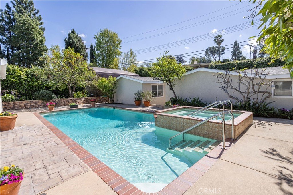 The kitchen sits at the heart of the home and features a large breakfast bar with seating, generous cabinetry, and ample counter space. A bright breakfast nook nearby offers a comfortable spot for casual meals and morning coffee. The home includes four well-sized bedrooms, including a primary suite with a private bathroom, plus the convenience of an inside laundry room. Step outside to a backyard designed for the Southern California lifestyle, featuring a private pool and oversized raised spa, expansive patio space for entertaining, and a stacked stone retaining wall with raised planters and mature landscaping that creates a private garden setting. A rare highlight is the two detached garages, offering flexibility for parking, storage, workshop space, or potential ADU conversion opportunities. Plus, a new roof, electrical panel, and fresh new paint. Located in desirable Woodland Hills, just minutes from Warner Center, The Village at Westfield Topanga, Westfield Topanga Mall, the Los Angeles Rams training facility, and convenient 101 freeway access, this property offers space, character, and future potential in one of the San Fernando Valley’s most sought-after communities.