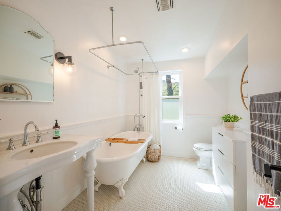Welcome to the ultimate Topanga retreat, where modern upgrades meet timeless canyon charm. Nestled on a quiet, hidden street off Topanga Canyon Blvd, this treasure offers the perfect balance of privacy, style, and connection to nature. Inside, an open entry concept features soaring vaulted ceilings extending both levels and a modern chandelier welcoming bright natural light. Upstairs, the space leads to two bedrooms, and a crisp, updated bathroom with a classic clawfoot tub. The spacious primary suite features a comfortable additional space to relax or work, and opens to its own private deck, the perfect spot to enjoy your morning coffee while taking in tree-lined canyon views. The large deck wraps around for great outdoor entertaining under delightful string lighting. The main floor effortlessly blends contemporary design with Topanga character. The recently remodeled kitchen boasts continuous-grain walnut cabinetry, white quartz countertops, high-end built-in appliances, and a generous island with waterfall, ideal for cooking and entertaining. Large double doors open to a beautifully landscaped fully-fenced flat backyard, inviting a harmonious indoor-outdoor flow. The dining area is framed by walnut finishes perfect for gatherings, while the cozy living room invites movie or game nights. A third bedroom with a remodeled en-suite bathroom adds comfort and flexibility. The extensive list of upgrades includes beautiful oak wood flooring, new windows and doors throughout, and a whole-house water filtration system. Step through the living room to discover a bonus entertainment room and direct access to the driveway, complete with automatic gate and EV charger. In the vicinity you'll find central access to the best of the westside and the valley communities. Featuring scenic drives to nearby beaches, Santa Monica, Malibu and Calabasas. Enjoy local gems including the Topanga Community Center, playground and ballfield, weekly farmers market, Food Truck Fridays, and charming coffee shops and cafes, combining peaceful canyon living with vibrant neighborhood amenities.