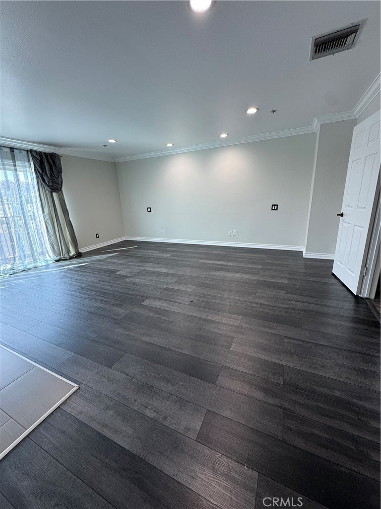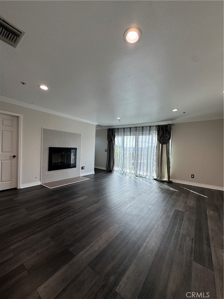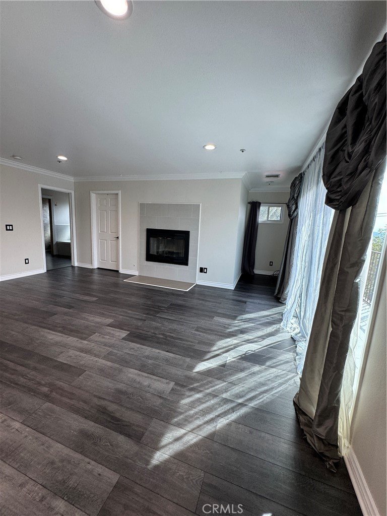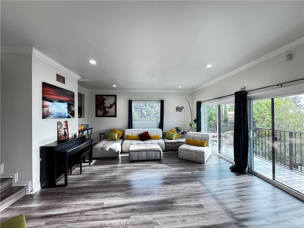 The grand, sun-filled living area showcases an elegant fireplace, rich wood-laminate flooring, and sophisticated recessed lighting. A stylish cutout window connects the space to the gourmet chef’s kitchen, featuring stainless steel appliances, sleek black countertops, and an expansive center island with a secondary sink—ideal for both entertaining and everyday living.